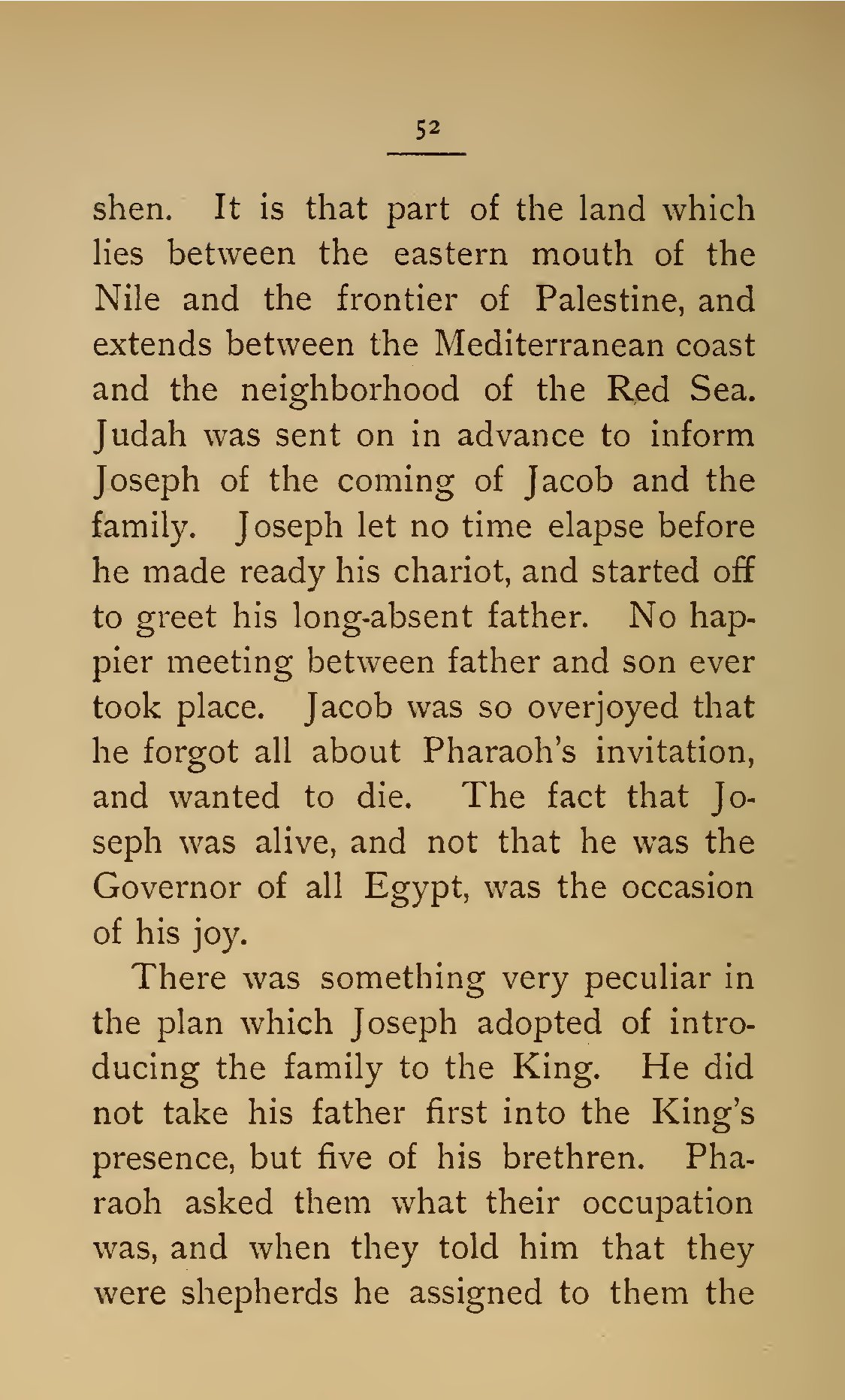 - 52 shen. It is that part of the land which lies between the eastern mouth of the Nile and the frontier of Palestine, and extends between the Mediterranean coast and the neighborhood of the Red Sea. Judah was sent on in advance to inform Joseph of the coming of Jacob and the family. Joseph let no time elapse before he made ready his chariot, and started off to greet his long-absent father. No happier meeting between father and son ever took place. Jacob was so overjoyed that he forgot all about Pharaoh’s invitation, and wanted to die. The fact that Joseph was alive, and not that he was the Governor of all Egypt, was the occasion of his joy. There was something very peculiar in the plan which Joseph adopted of introducing the family to the King. He did not take his father first into the King’s presence, but five of his brethren. Pharaoh asked them what their occupation was, and when they told him that they were shepherds he assigned to them the