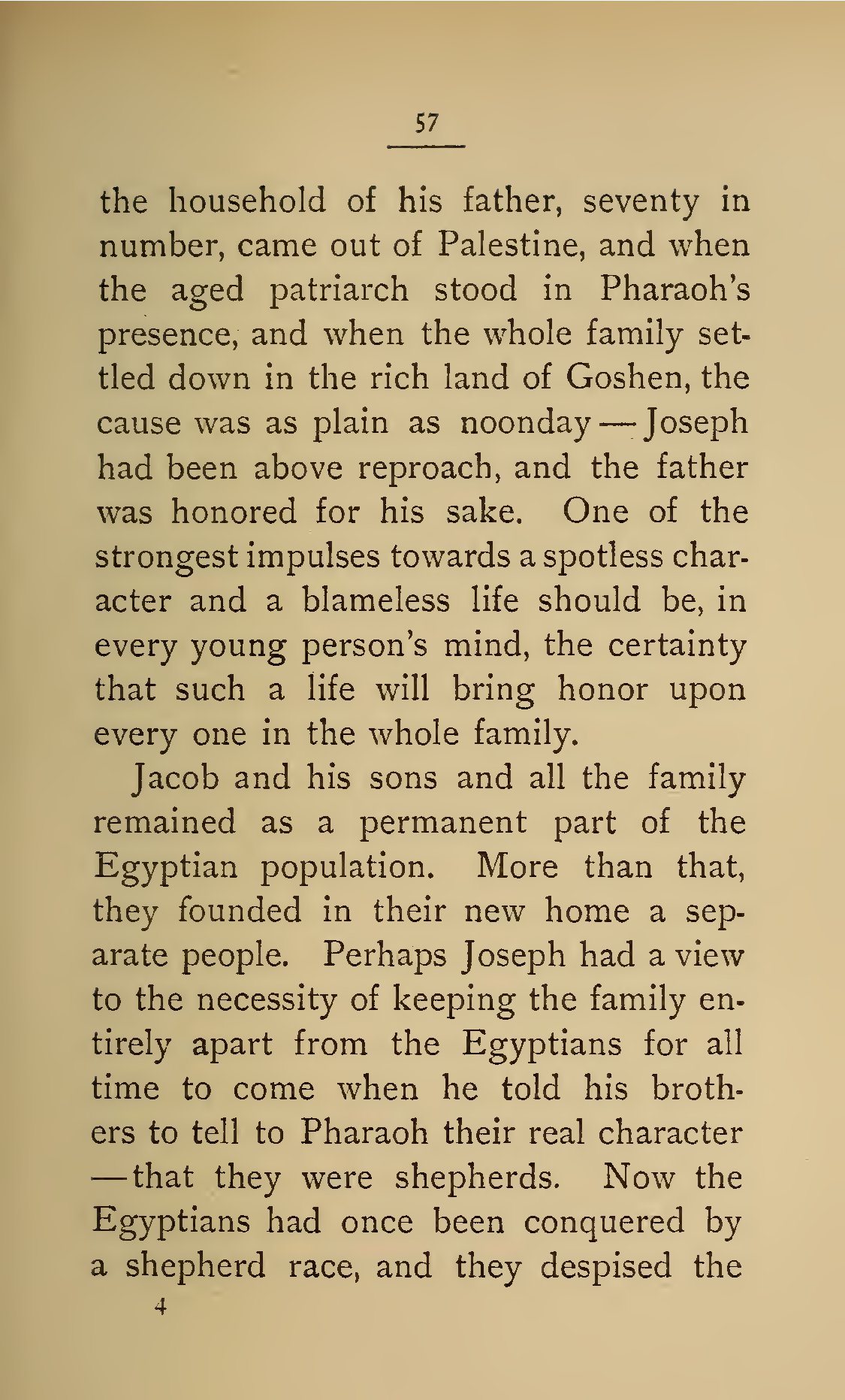 - 57 the household of his father, seventy in number, came out of Palestine, and when the aged patriarch stood in Pharaoh’s presence, and when the whole family settled down in the rich land of Goshen, the cause was as plain as noonday—Joseph had been above reproach, and the father was honored for his sake. One of the strongest impulses towards a spotless character and a blameless life should be, in every young person’s mind, the certainty that such a life will bring honor upon every one in the whole family. Jacob and his sons and all the family remained as a permanent part of the Egyptian population. More than that, they founded in their new home a separate people. Perhaps Joseph had a view to the necessity of keeping the family entirely apart from the Egyptians for all time to come when he told his brothers to tell to Pharaoh their real character—that they were shepherds. Now the Egyptians had once been conquered by a shepherd race, and they despised the 4