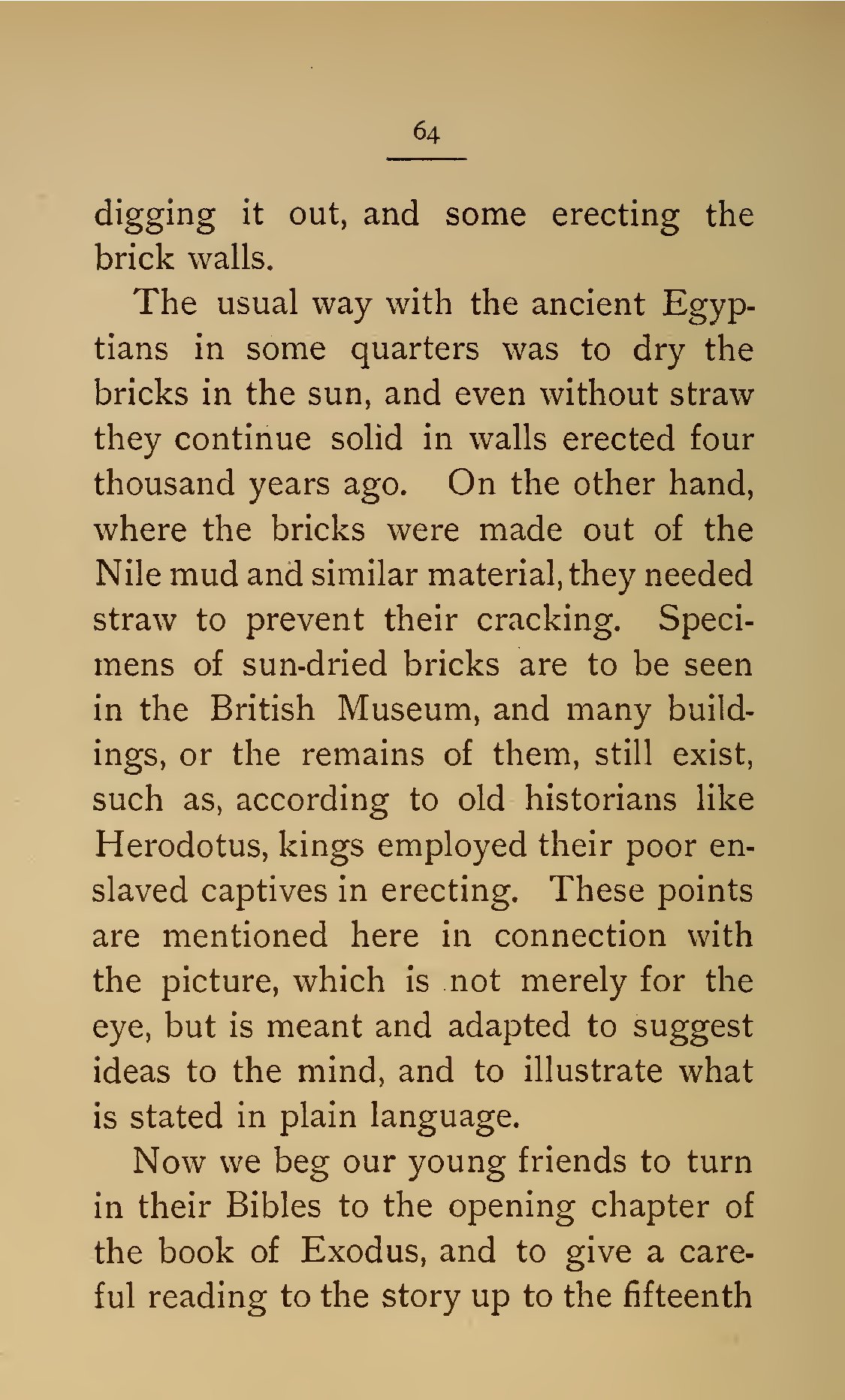 - 64 digging it out, and some erecting the brick walls. The usual way with the ancient Egyptians in some quarters was to dry the bricks in the sun, and even without straw they continue solid in walls erected four thousand years ago. On the other hand, where the bricks were made out of the Nile mud and similar material, they needed straw to prevent their cracking. Specimens of sun-dried bricks are to be seen in the British Museum, and many buildings, or the remains of them, still exist, such as, according to old historians like Herodotus, kings employed their poor enslaved captives in erecting. These points are mentioned here in connection with the picture, which is not merely for the eye, but is meant and adapted to suggest ideas to the mind, and to illustrate what is stated in plain language. Now we beg our young friends to turn in their Bibles to the opening chapter of the book of Exodus, and to give a careful reading to the story up to the fifteenth