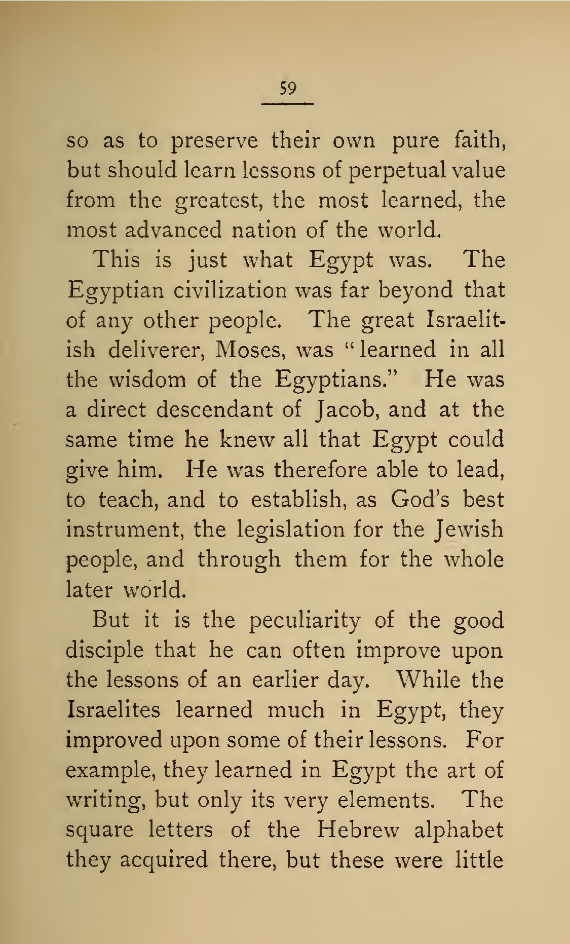 - 59 so as to preserve their own pure faith, but should learn lessons of perpetual value from the greatest, the most learned, the most advanced nation of the world. This is just what Egypt was. The Egyptian civilization was far beyond that of any other people. The great Israelitish deliverer, Moses, was “learned in all the wisdom of the Egyptians.” He was a direct descendant of Jacob, and at the same time he knew all that Egypt could give him. He was therefore able to lead, to teach, and to establish, as God’s best instrument, the legislation for the Jewish people, and through them for the whole later world. But it is the peculiarity of the good disciple that he can often improve upon the lessons of an earlier day. While the Israelites learned much in Egypt, they improved upon some of their lessons. For example, they learned in Egypt the art of writing, but only its very elements. The square letters of the Hebrew alphabet they acquired there, but these were little
