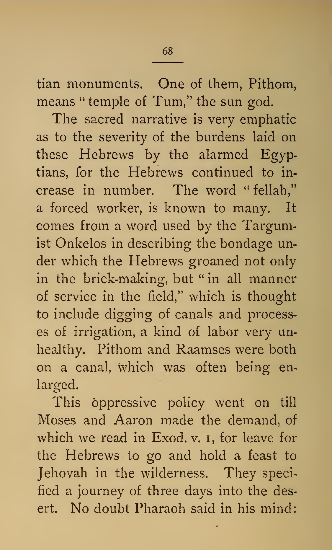 - 68 tian monuments. One of them, Pithom, means “temple of Tum,” the sun god. The sacred narrative is very emphatic as to the severity of the burdens laid on these Hebrews by the alarmed Egyptians, for the Hebrews continued to increase in number. The word “fellah,” a forced worker, is known to many. It comes from a word used by the Targum-ist Onkelos in describing the bondage under which the Hebrews groaned not only in the brick-making, but “in all manner of service in the field,” which is thought to include digging of canals and processes of irrigation, a kind of labor very unhealthy. Pithom and Raamses were both on a canal, which was often being enlarged. This oppressive policy went on till Moses and Aaron made the demand, of which we read in Exod. v. 1, for leave for the Hebrews to go and hold a feast to Jehovah in the wilderness. They specified a journey of three days into the desert. No doubt Pharaoh said in his mind: