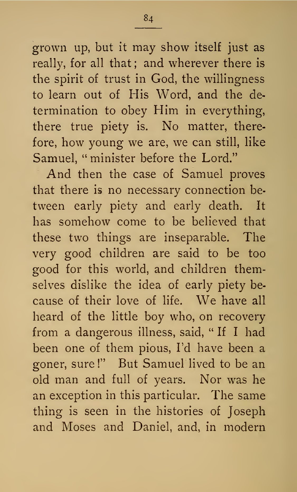- 84 grown up, but it may show itself just as really, for all that; and wherever there is the spirit of trust in God, the willingness to learn out of His Word, and the determination to obey Him in everything, there true piety is. No matter, therefore, how young we are, we can still, like Samuel, “minister before the Lord.” And then the case of Samuel proves that there is no necessary connection between early piety and early death. It has somehow come to be believed that these two things are inseparable. The very good children are said to be too good for this world, and children themselves dislike the idea of early piety because of their love of life. We have all heard of the little boy who, on recovery from a dangerous illness, said, “If I had been one of them pious, I’d have been a goner, sure!” But Samuel lived to be an old man and full of years. Nor was he an exception in this particular. The same thing is seen in the histories of Joseph and Moses and Daniel, and, in modern