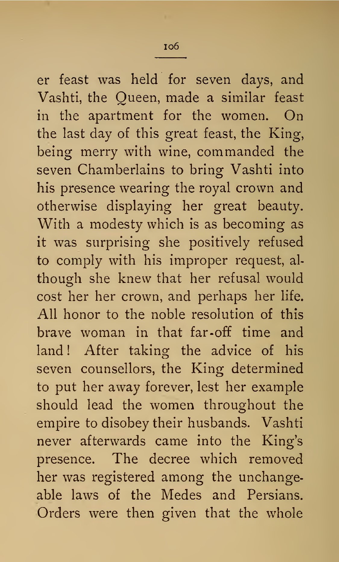 - 106 er feast was held for seven days, and Vashti, the Queen, made a similar feast in the apartment for the women. On the last day of this great feast, the King, being merry with wine, commanded the seven Chamberlains to bring Vashti into his presence wearing the royal crown and otherwise displaying her great beauty. With a modesty which is as becoming as it was surprising she positively refused to comply with his improper request, although she knew that her refusal would cost her her crown, and perhaps her life. All honor to the noble resolution of this brave woman in that far-off time and land! After taking the advice of his seven counsellors, the King determined to put her away forever, lest her example should lead the women throughout the empire to disobey their husbands. Vashti never afterwards came into the King’s presence. The decree which removed her was registered among the unchangeable laws of the Medes and Persians. Orders were then given that the whole