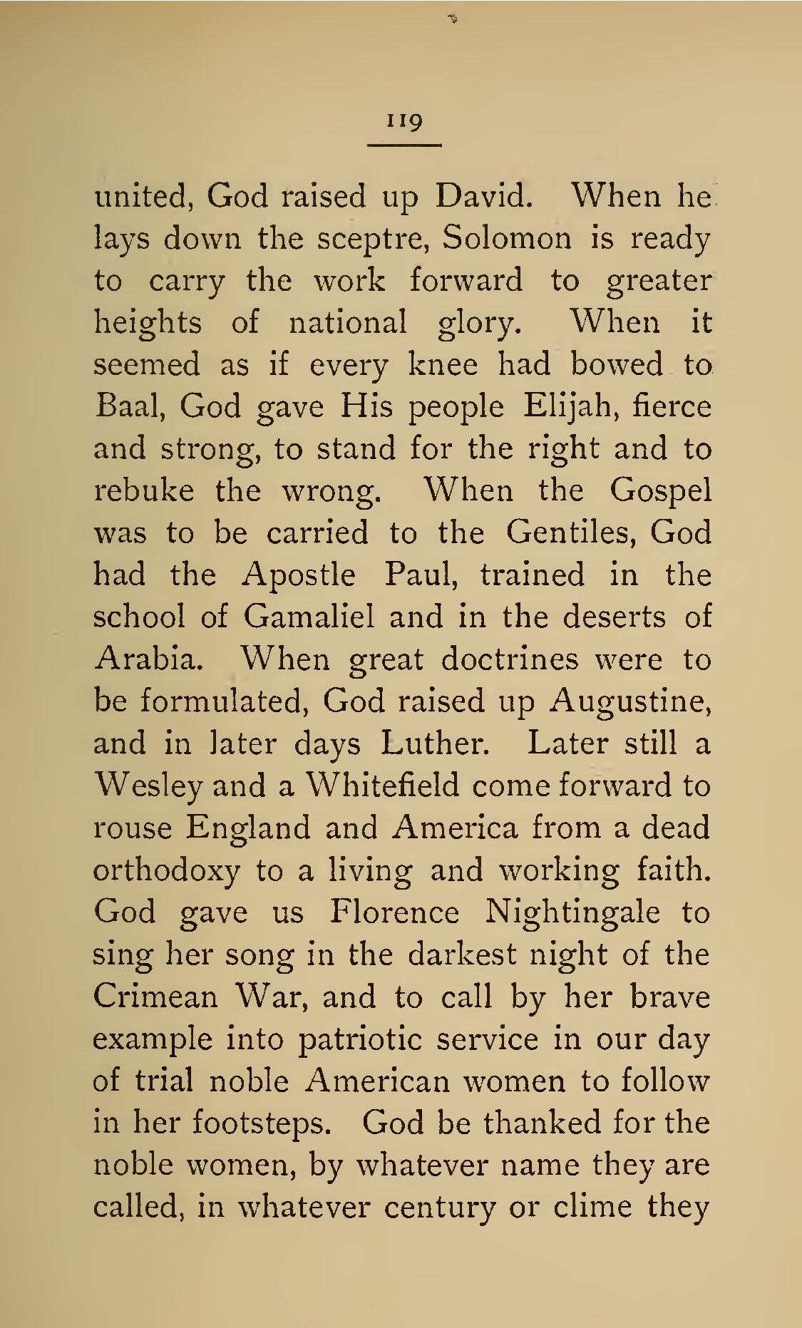 - 119 united, God raised up David. When he lays down the sceptre, Solomon is ready to carry the work forward to greater heights of national glory. When it seemed as if every knee had bowed to Baal, God gave His people Elijah, fierce and strong, to stand for the right and to rebuke the wrong. When the Gospel was to be carried to the Gentiles, God had the Apostle Paul, trained in the school of Gamaliel and in the deserts of Arabia. When great doctrines were to be formulated, God raised up Augustine, and in later days Luther. Later still a Wesley and a Whitefield come forward to rouse England and America from a dead orthodoxy to a living and working faith. God gave us Florence Nightingale to sing her song in the darkest night of the Crimean War, and to call by her brave example into patriotic service in our day of trial noble American women to follow in her footsteps. God be thanked for the noble women, by whatever name they are called, in whatever century or clime they