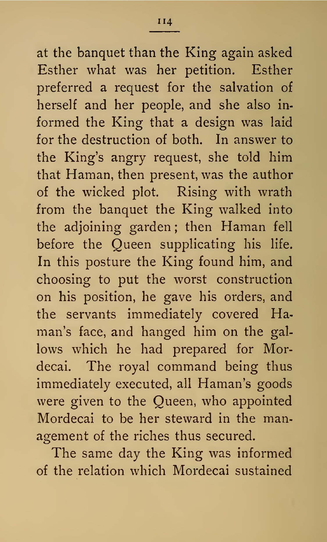 - 114 at the banquet than the King again asked Esther what was her petition. Esther preferred a request for the salvation of herself and her people, and she also informed the King that a design was laid for the destruction of both. In answer to the King’s angry request, she told him that Haman, then present, was the author of the wicked plot. Rising with wrath from the banquet the King walked into the adjoining garden; then Haman fell before the Queen supplicating his life. In this posture the King found him, and choosing to put the worst construction on his position, he gave his orders, and the servants immediately covered Haman’s face, and hanged him on the gallows which he had prepared for Mordecai. The royal command being thus immediately executed, all Haman’s goods were given to the Queen, who appointed Mordecai to be her steward in the management of the riches thus secured. The same day the King was informed of the relation which Mordecai sustained