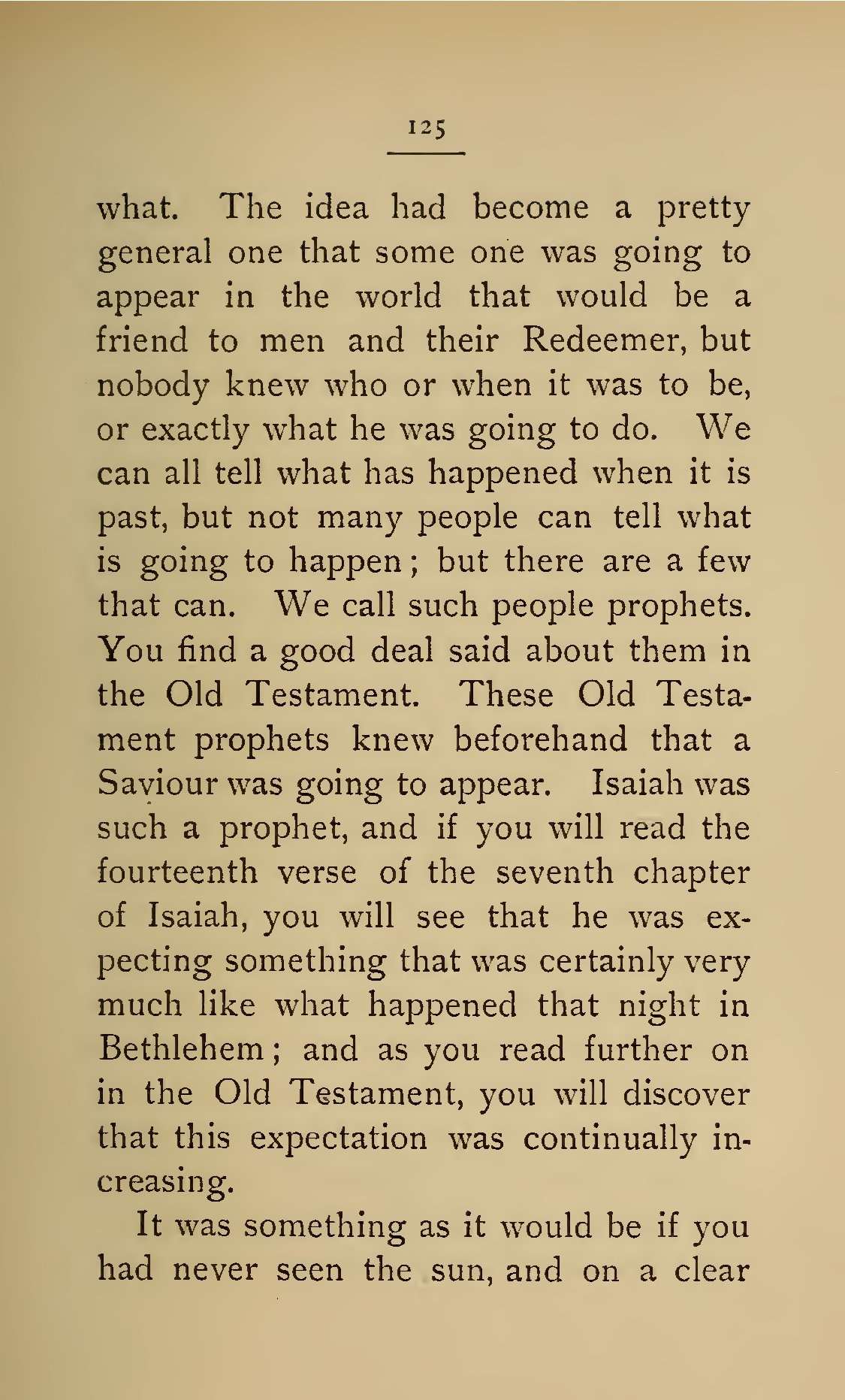 - 125 what. The idea had become a pretty general one that some one was going to appear in the world that would be a friend to men and their Redeemer, but nobody knew who or when it was to be, or exactly what he was going to do. We can all tell what has happened when it is past, but not many people can tell what is going to happen; but there are a few that can. We call such people prophets. You find a good deal said about them in the Old Testament. These Old Testament prophets knew beforehand that a Saviour was going to appear. Isaiah was such a prophet, and if you will read the fourteenth verse of the seventh chapter of Isaiah, you will see that he was expecting something that was certainly very much like what happened that night in Bethlehem; and as you read further on in the Old Testament, you will discover that this expectation was continually increasing. It was something as it would be if you had never seen the sun, and on a clear