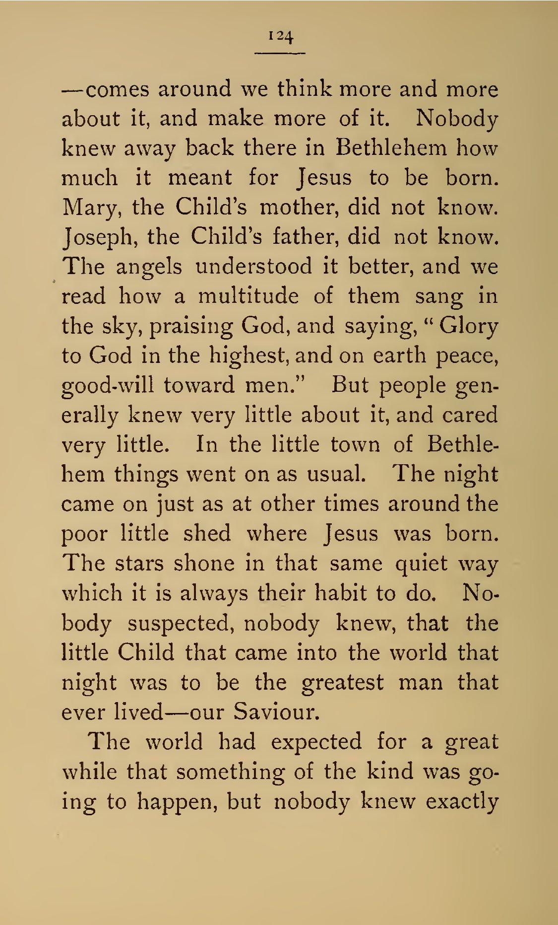 - 124 —comes around we think more and more about it, and make more of it. Nobody knew away back there in Bethlehem how much it meant for Jesus to be born. Mary, the Child’s mother, did not know. Joseph, the Child’s father, did not know. The angels understood it better, and we read how a multitude of them sang in the sky, praising God, and saying, “Glory to God in the highest, and on earth peace, good-will toward men.” But people generally knew very little about it, and cared very little. In the little town of Bethlehem things went on as usual. The night came on just as at other times around the poor little shed where Jesus was born. The stars shone in that same quiet way which it is always their habit to do. Nobody suspected, nobody knew, that the little Child that came into the world that night was to be the greatest man that ever lived—our Saviour. The world had expected for a great while that something of the kind was going to happen, but nobody knew exactly