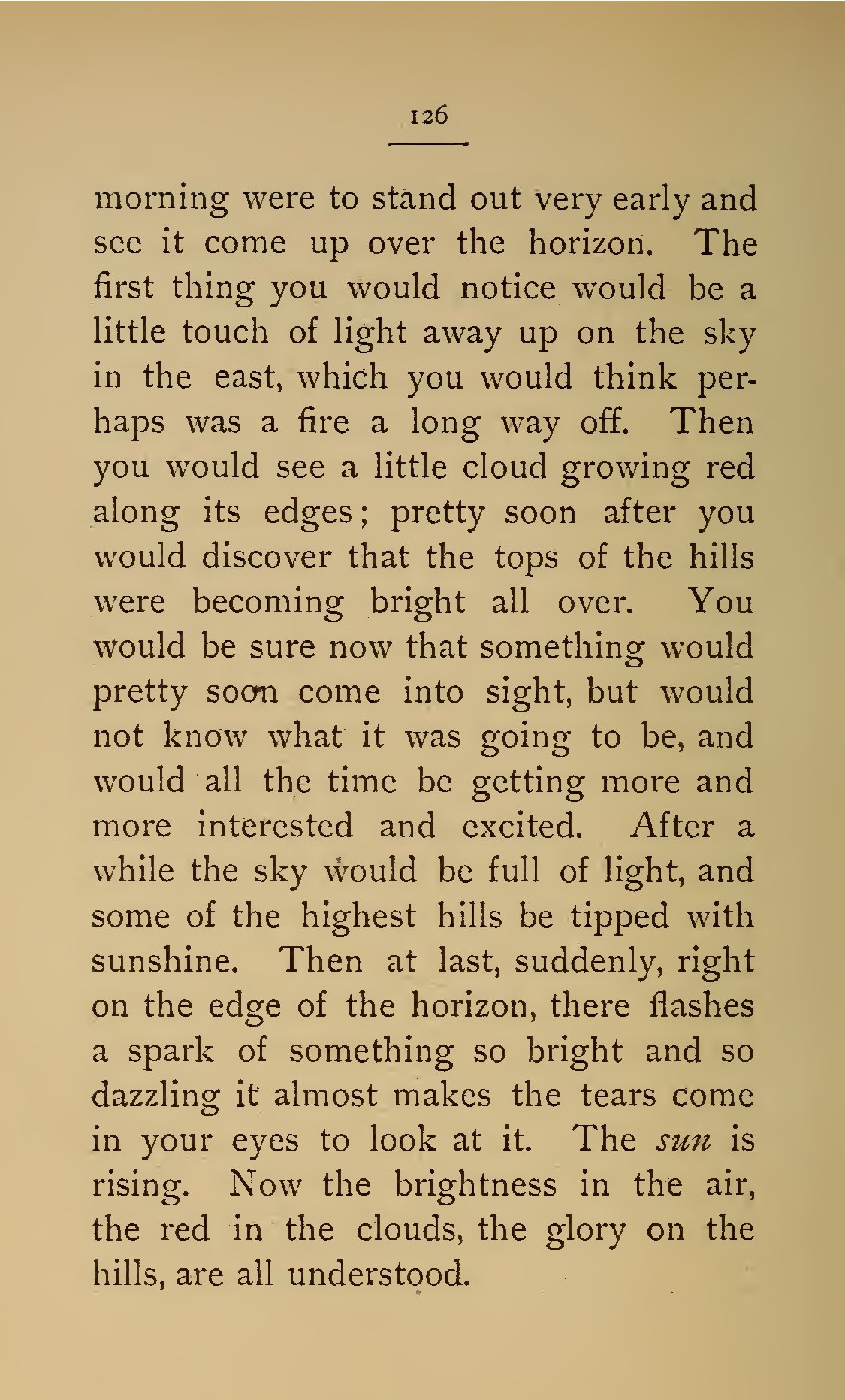 - 126 morning were to stand out very early and see it come up over the horizon. The first thing you would notice would be a little touch of light away up on the sky in the east, which you would think perhaps was a fire a long way off. Then you would see a little cloud growing red along its edges; pretty soon after you would discover that the tops of the hills were becoming bright all over. You would be sure now that something would pretty soon come into sight, but would not know what it was going to be, and would all the time be getting more and more interested and excited. After a while the sky would be full of light, and some of the highest hills be tipped with sunshine. Then at last, suddenly, right on the edge of the horizon, there flashes a spark of something so bright and so dazzling it almost makes the tears come in your eyes to look at it. The *sun* is rising. Now the brightness in the air, the red in the clouds, the glory on the hills, are all understood.