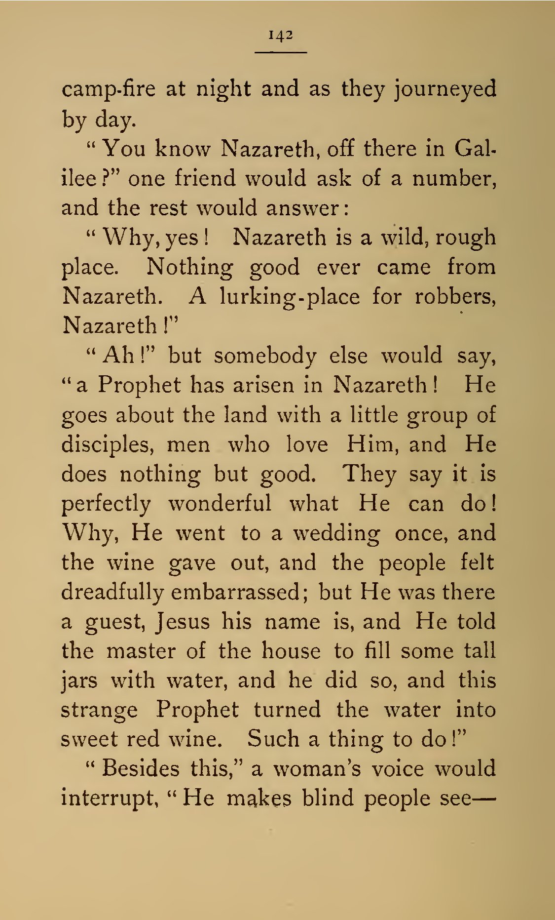 - 142 camp-fire at night and as they journeyed by day. “You know Nazareth, off there in Galilee?” one friend would ask of a number, and the rest would answer: “Why, yes! Nazareth is a wild, rough place. Nothing good ever came from Nazareth. A lurking-place for robbers, Nazareth!” “Ah!” but somebody else would say, “a Prophet has arisen in Nazareth! He goes about the land with a little group of disciples, men who love Him, and He does nothing but good. They say it is perfectly wonderful what He can do! Why, He went to a wedding once, and the wine gave out, and the people felt dreadfully embarrassed; but He was there a guest, Jesus his name is, and He told the master of the house to fill some tall jars with water, and he did so, and this strange Prophet turned the water into sweet red wine. Such a thing to do!” “Besides this,” a woman’s voice would interrupt, “He makes blind people see—