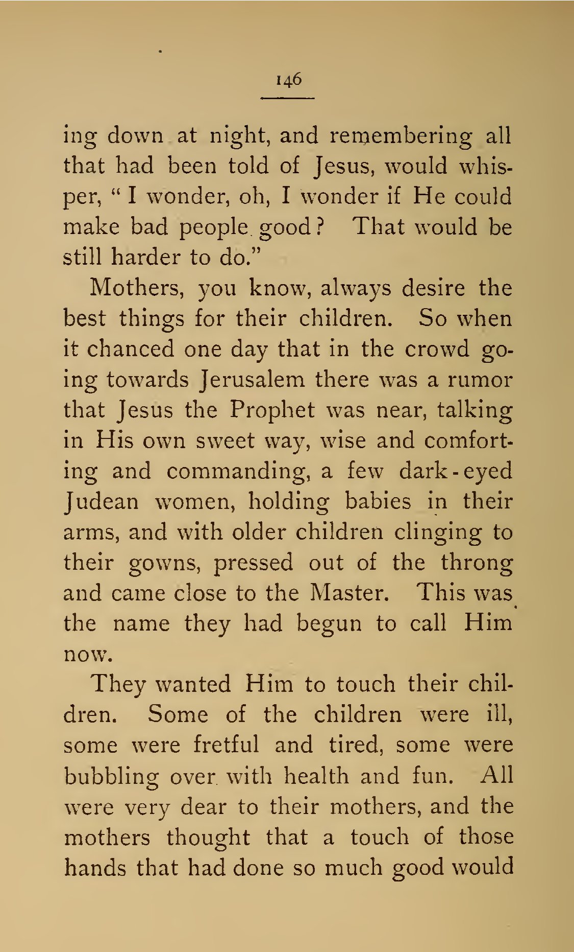- 146 ing down at night, and remembering all that had been told of Jesus, would whisper, “I wonder, oh, I wonder if He could make bad people good? That would be still harder to do.” Mothers, you know, always desire the best things for their children. So when it chanced one day that in the crowd going towards Jerusalem there was a rumor that Jesus the Prophet was near, talking in His own sweet way, wise and comforting and commanding, a few dark-eyed Judean women, holding babies in their arms, and with older children clinging to their gowns, pressed out of the throng and came close to the Master. This was the name they had begun to call Him now. They wanted Him to touch their children. Some of the children were ill, some were fretful and tired, some were bubbling over with health and fun. All were very dear to their mothers, and the mothers thought that a touch of those hands that had done so much good would