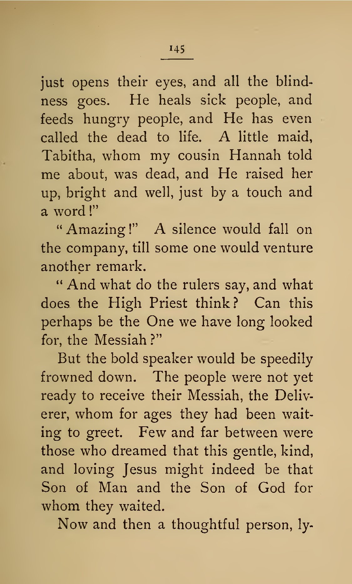 - 145 just opens their eyes, and all the blindness goes. He heals sick people, and feeds hungry people, and He has even called the dead to life. A little maid, Tabitha, whom my cousin Hannah told me about, was dead, and He raised her up, bright and well, just by a touch and a word!” “Amazing!” A silence would fall on the company, till some one would venture another remark. “And what do the rulers say, and what does the High Priest think? Can this perhaps be the One we have long looked for, the Messiah?” But the bold speaker would be speedily frowned down. The people were not yet ready to receive their Messiah, the Deliverer, whom for ages they had been waiting to greet. Few and far between were those who dreamed that this gentle, kind, and loving Jesus might indeed be that Son of Man and the Son of God for whom they waited. Now and then a thoughtful person, ly-