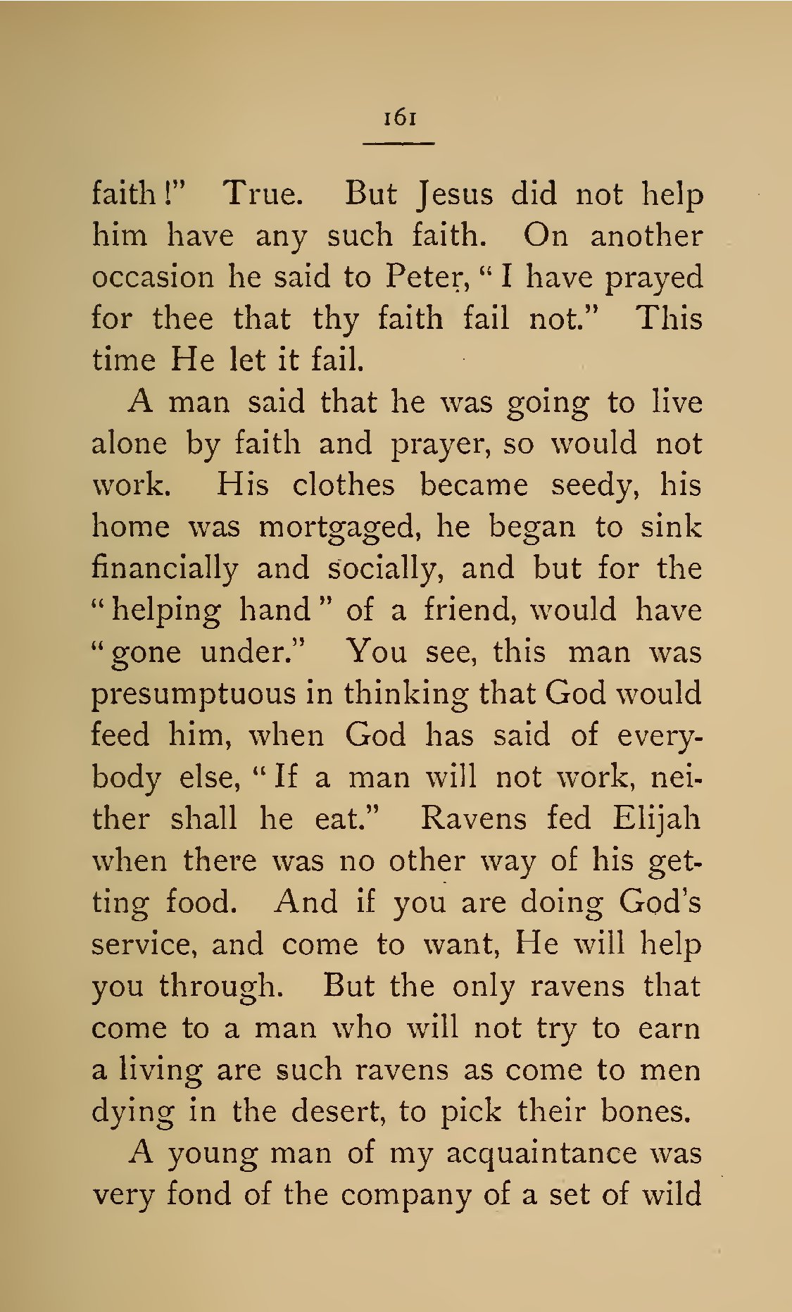 - 161 faith!” True. But Jesus did not help him have any such faith. On another occasion he said to Peter, “I have prayed for thee that thy faith fail not.” This time He let it fail. A man said that he was going to live alone by faith and prayer, so would not work. His clothes became seedy, his home was mortgaged, he began to sink financially and socially, and but for the “helping hand” of a friend, would have “gone under.” You see, this man was presumptuous in thinking that God would feed him, when God has said of everybody else, “If a man will not work, neither shall he eat.” Ravens fed Elijah when there was no other way of his getting food. And if you are doing God’s service, and come to want, He will help you through. But the only ravens that come to a man who will not try to earn a living are such ravens as come to men dying in the desert, to pick their bones. A young man of my acquaintance was very fond of the company of a set of wild