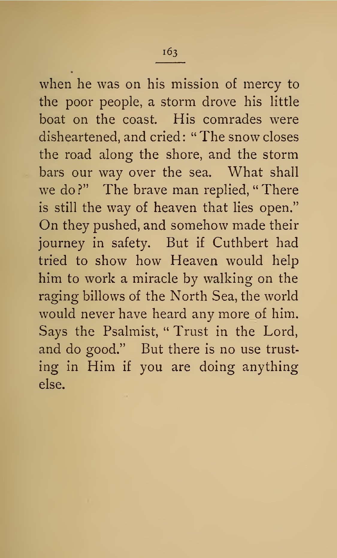 - 163 when he was on his mission of mercy to the poor people, a storm drove his little boat on the coast. His comrades were disheartened, and cried: “The snow closes the road along the shore, and the storm bars our way over the sea. What shall we do?” The brave man replied, “There is still the way of heaven that lies open.” On they pushed, and somehow made their journey in safety. But if Cuthbert had tried to show how Heaven would help him to work a miracle by walking on the raging billows of the North Sea, the world would never have heard any more of him. Says the Psalmist, “Trust in the Lord, and do good.” But there is no use trusting in Him if you are doing anything else.