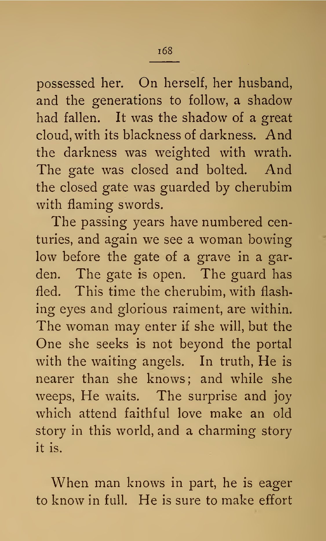 - 168 possessed her. On herself, her husband, and the generations to follow, a shadow had fallen. It was the shadow of a great cloud, with its blackness of darkness. And the darkness was weighted with wrath. The gate was closed and bolted. And the closed gate was guarded by cherubim with flaming swords. The passing years have numbered centuries, and again we see a woman bowing low before the gate of a grave in a garden. The gate is open. The guard has fled. This time the cherubim, with flashing eyes and glorious raiment, are within. The woman may enter if she will, but the One she seeks is not beyond the portal with the waiting angels. In truth, He is nearer than she knows; and while she weeps, He waits. The surprise and joy which attend faithful love make an old story in this world, and a charming story it is. When man knows in part, he is eager to know in full. He is sure to make effort