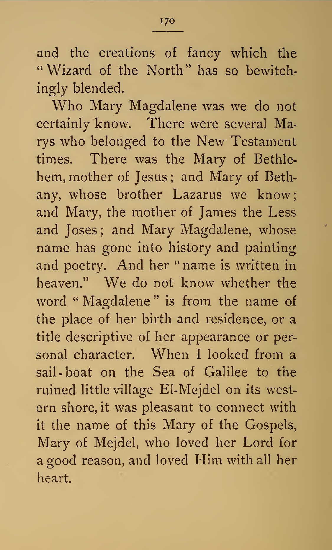 - 170 and the creations of fancy which the “Wizard of the North” has so bewitchingly blended. Who Mary Magdalene was we do not certainly know. There were several Marys who belonged to the New Testament times. There was the Mary of Bethlehem, mother of Jesus; and Mary of Bethany, whose brother Lazarus we know; and Mary, the mother of James the Less and Joses; and Mary Magdalene, whose name has gone into history and painting and poetry. And her “name is written in heaven.” We do not know whether the word “Magdalene” is from the name of the place of her birth and residence, or a title descriptive of her appearance or personal character. When I looked from a sail-boat on the Sea of Galilee to the ruined little village El-Mejdel on its western shore, it was pleasant to connect with it the name of this Mary of the Gospels, Mary of Mejdel, who loved her Lord for a good reason, and loved Him with all her heart.