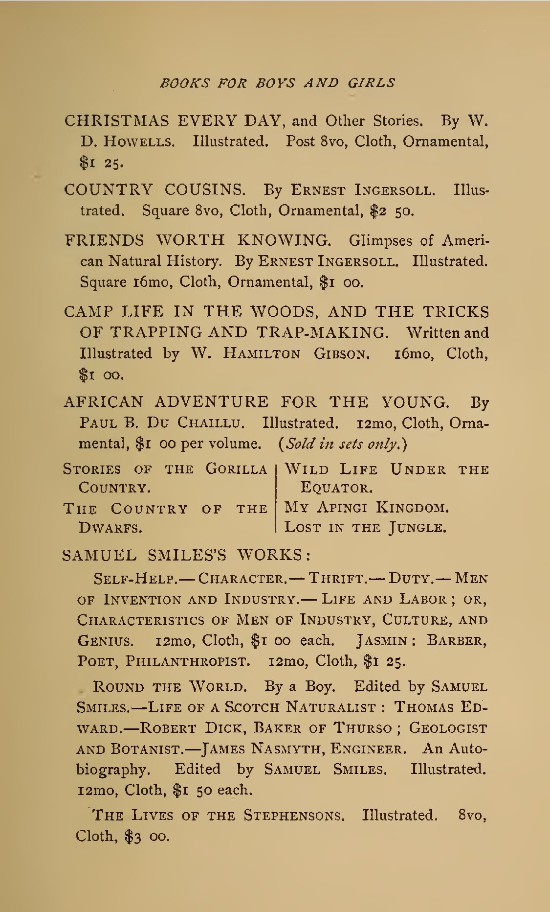 SELF-HELP.—CHARACTER.—THRIFT.—DUTY.—MEN OF INVENTION AND INDUSTRY.—LIFE AND LABOR; OR, CHARACTERISTICS OF MEN OF INDUSTRY, CULTURE, AND GENIUS. 12mo, Cloth, $1 00 each. JASMIN: BARBER, POET, PHILANTHROPIST. 12mo, Cloth, $1 25.