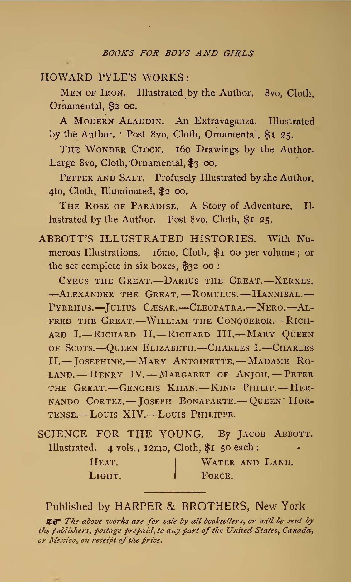 - # BOOKS FOR BOYS AND GIRLS ## HOWARD PYLE'S WORKS: **MEN OF IRON.** Illustrated by the Author. 8vo, Cloth, Ornamental, $2 00. **A MODERN ALADDIN.** An Extravaganza. Illustrated by the Author. Post 8vo, Cloth, Ornamental, $1 25. **THE WONDER CLOCK.** 160 Drawings by the Author. Large 8vo, Cloth, Ornamental, $3 00. **PEPPER AND SALT.** Profusely Illustrated by the Author. 4to, Cloth, Illuminated, $2 00. **THE ROSE OF PARADISE.** A Story of Adventure. Illustrated by the Author. Post 8vo, Cloth, $1 25. ## ABBOTT'S ILLUSTRATED HISTORIES. With Numerous Illustrations. 16mo, Cloth, $1 00 per volume; or the set complete in six boxes, $32 00: **CYRUS THE GREAT.**—DARIUS THE GREAT.—Xerxes.—Alexander the Great.—Romulus.—Hannibal.—Pyrrhus.—Julius Caesar.—Cleopatra.—Nero.—Alfred the Great.—William the Conqueror.—Richard I.—Richard II.—Richard III.—Mary Queen of Scots.—Queen Elizabeth.—Charles I.—Charles II.—Josephine.—Mary Antoinette.—Madame Roland.—Henry IV.—Margaret of Anjou.—Peter the Great.—Genghis Khan.—King Philip.—Hernando Cortez.—Joseph Bonaparte.—Queen Hortense.—Louis XIV.—Louis Philippe. ## SCIENCE FOR THE YOUNG. By Jacob Abbott. Illustrated. 4 vols., 12mo, Cloth, $1 50 each: | HEAT. | WATER AND LAND. | | --- | --- | | LIGHT. | FORCE. | Published by HARPER & BROTHERS, New York The above works are for sale by all booksellers, or will be sent by the publishers, postage prepaid, to any part of the United States, Canada, or Mexico, on receipt of the price.