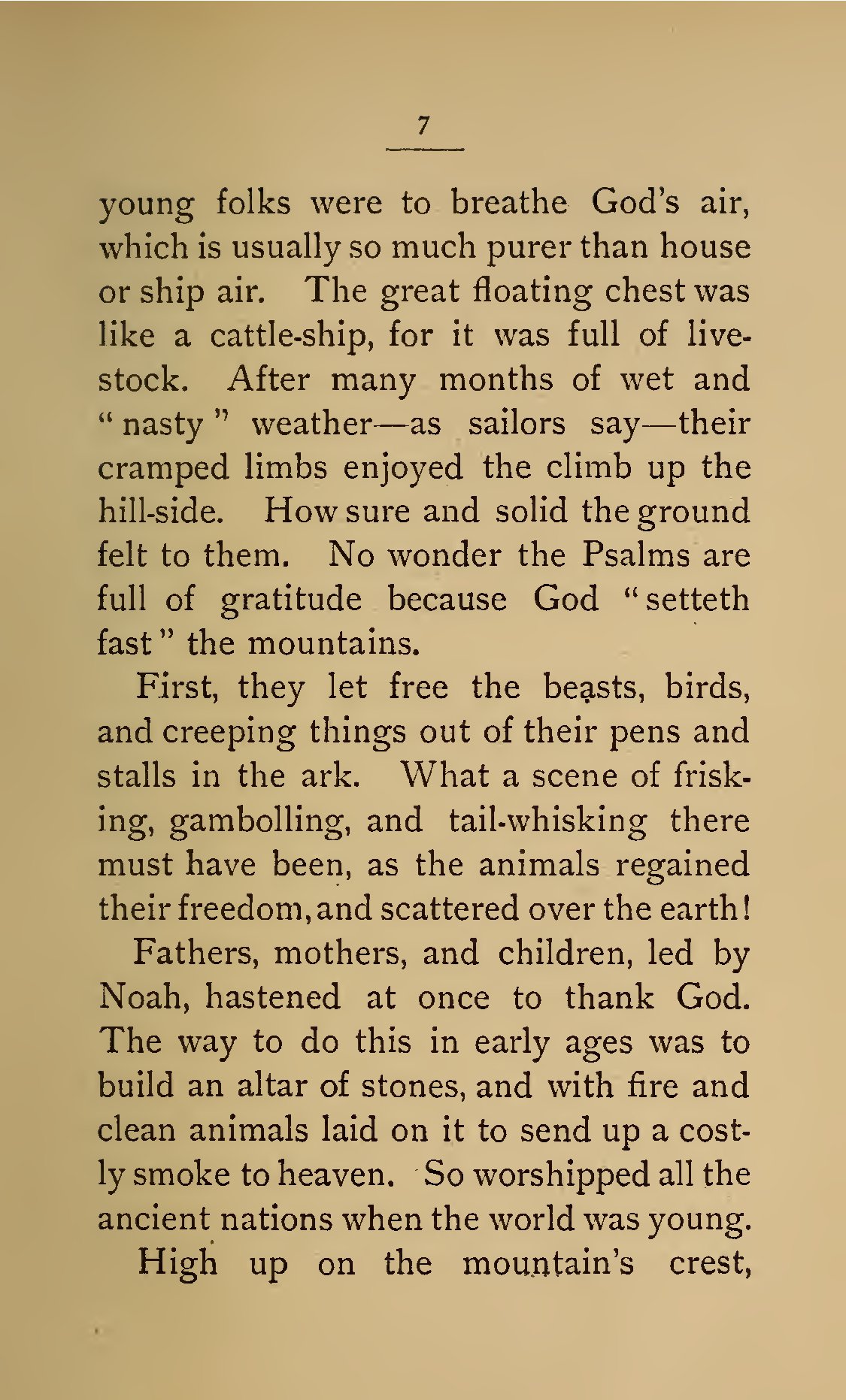 - 7 young folks were to breathe God’s air, which is usually so much purer than house or ship air. The great floating chest was like a cattle-ship, for it was full of livestock. After many months of wet and “nasty” weather—as sailors say—their cramped limbs enjoyed the climb up the hill-side. How sure and solid the ground felt to them. No wonder the Psalms are full of gratitude because God “setteth fast” the mountains. First, they let free the beasts, birds, and creeping things out of their pens and stalls in the ark. What a scene of frisking, gambolling, and tail-whisking there must have been, as the animals regained their freedom, and scattered over the earth! Fathers, mothers, and children, led by Noah, hastened at once to thank God. The way to do this in early ages was to build an altar of stones, and with fire and clean animals laid on it to send up a costly smoke to heaven. So worshipped all the ancient nations when the world was young. High up on the mountain’s crest,