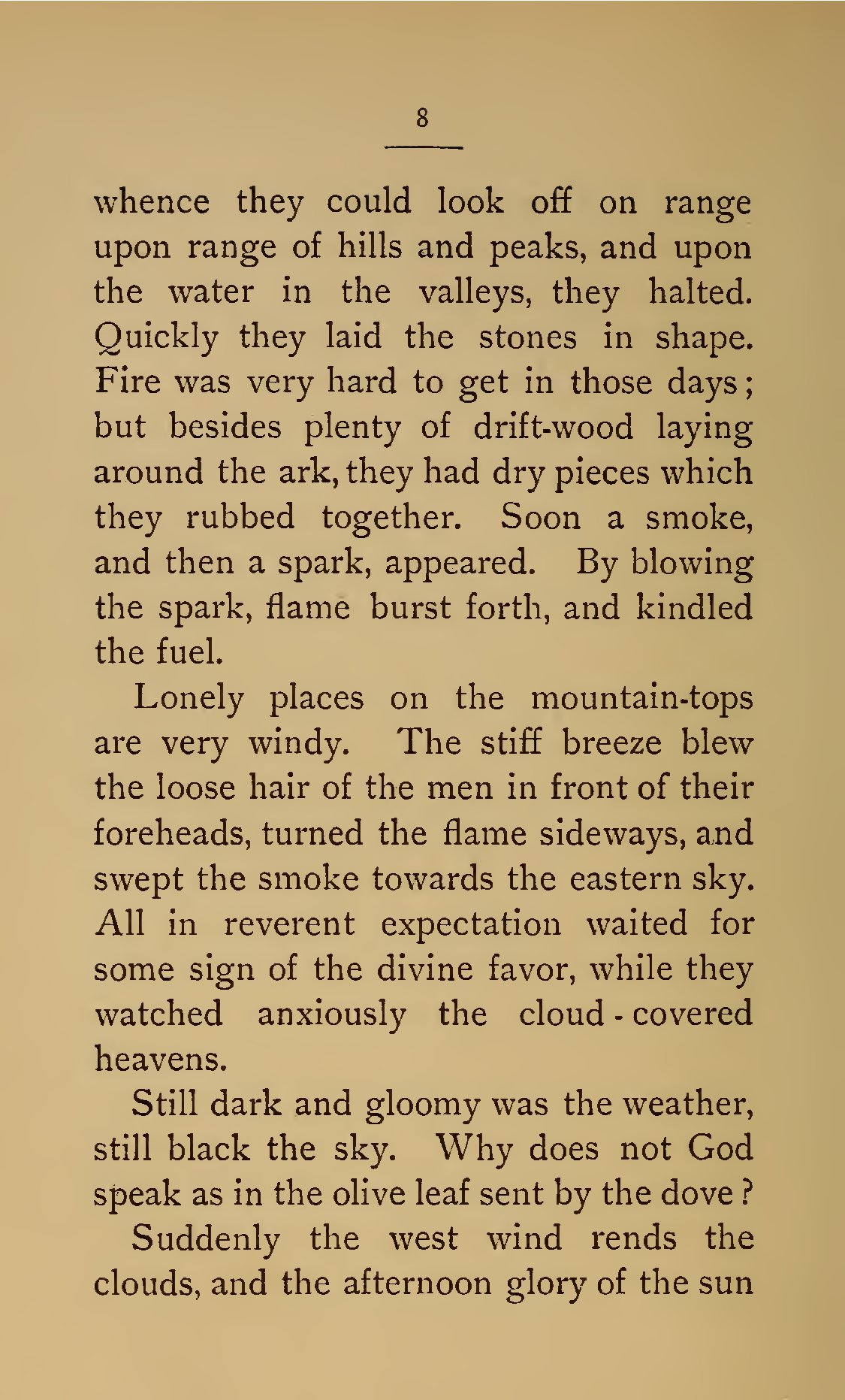 - 8 whence they could look off on range upon range of hills and peaks, and upon the water in the valleys, they halted. Quickly they laid the stones in shape. Fire was very hard to get in those days; but besides plenty of drift-wood laying around the ark, they had dry pieces which they rubbed together. Soon a smoke, and then a spark, appeared. By blowing the spark, flame burst forth, and kindled the fuel. Lonely places on the mountain-tops are very windy. The stiff breeze blew the loose hair of the men in front of their foreheads, turned the flame sideways, and swept the smoke towards the eastern sky. All in reverent expectation waited for some sign of the divine favor, while they watched anxiously the cloud-covered heavens. Still dark and gloomy was the weather, still black the sky. Why does not God speak as in the olive leaf sent by the dove? Suddenly the west wind rends the clouds, and the afternoon glory of the sun