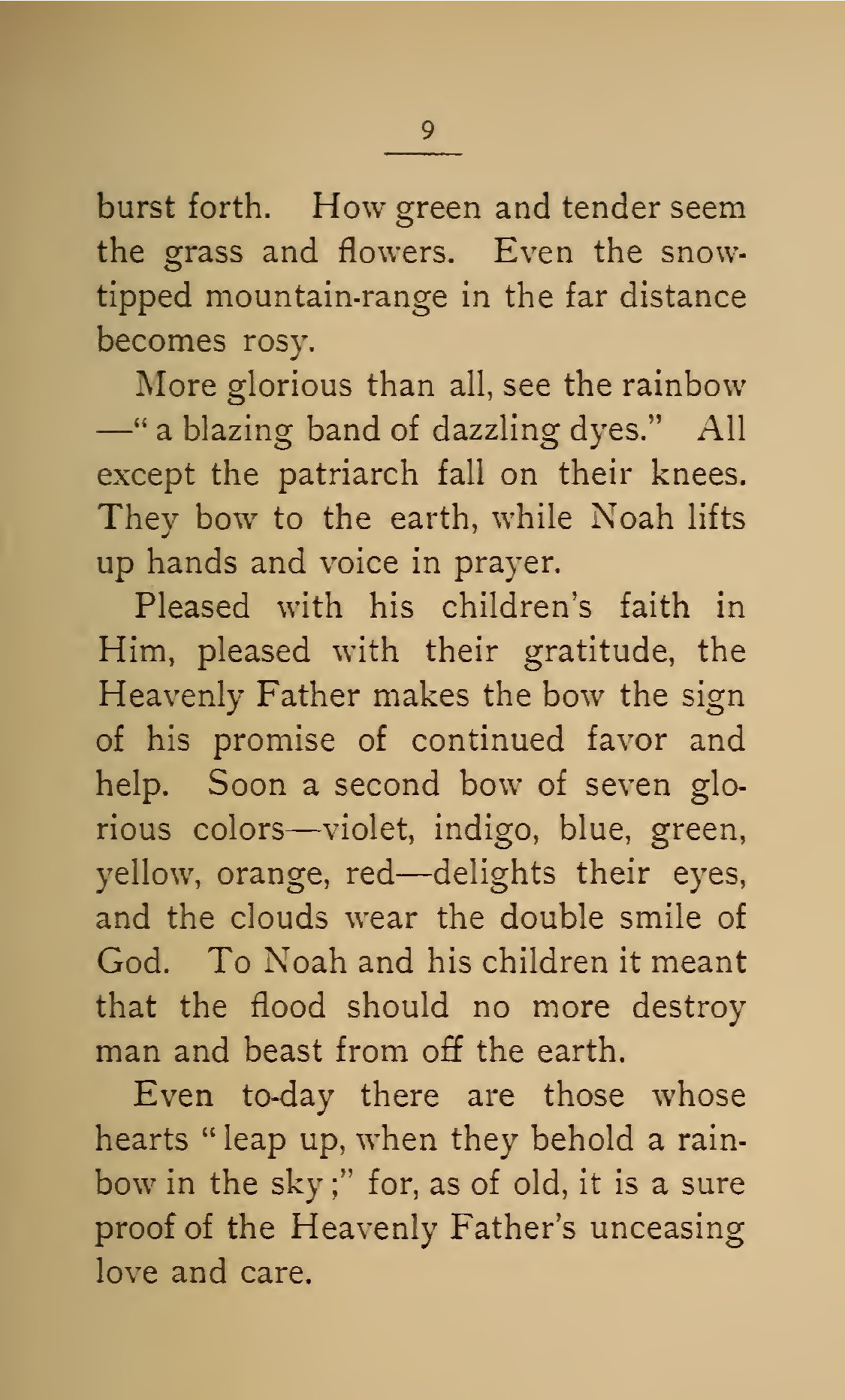 - 9 burst forth. How green and tender seem the grass and flowers. Even the snow-tipped mountain-range in the far distance becomes rosy. More glorious than all, see the rainbow—"a blazing band of dazzling dyes." All except the patriarch fall on their knees. They bow to the earth, while Noah lifts up hands and voice in prayer. Pleased with his children's faith in Him, pleased with their gratitude, the Heavenly Father makes the bow the sign of his promise of continued favor and help. Soon a second bow of seven glorious colors—violet, indigo, blue, green, yellow, orange, red—delights their eyes, and the clouds wear the double smile of God. To Noah and his children it meant that the flood should no more destroy man and beast from off the earth. Even to-day there are those whose hearts “leap up, when they behold a rainbow in the sky;” for, as of old, it is a sure proof of the Heavenly Father’s unceasing love and care.