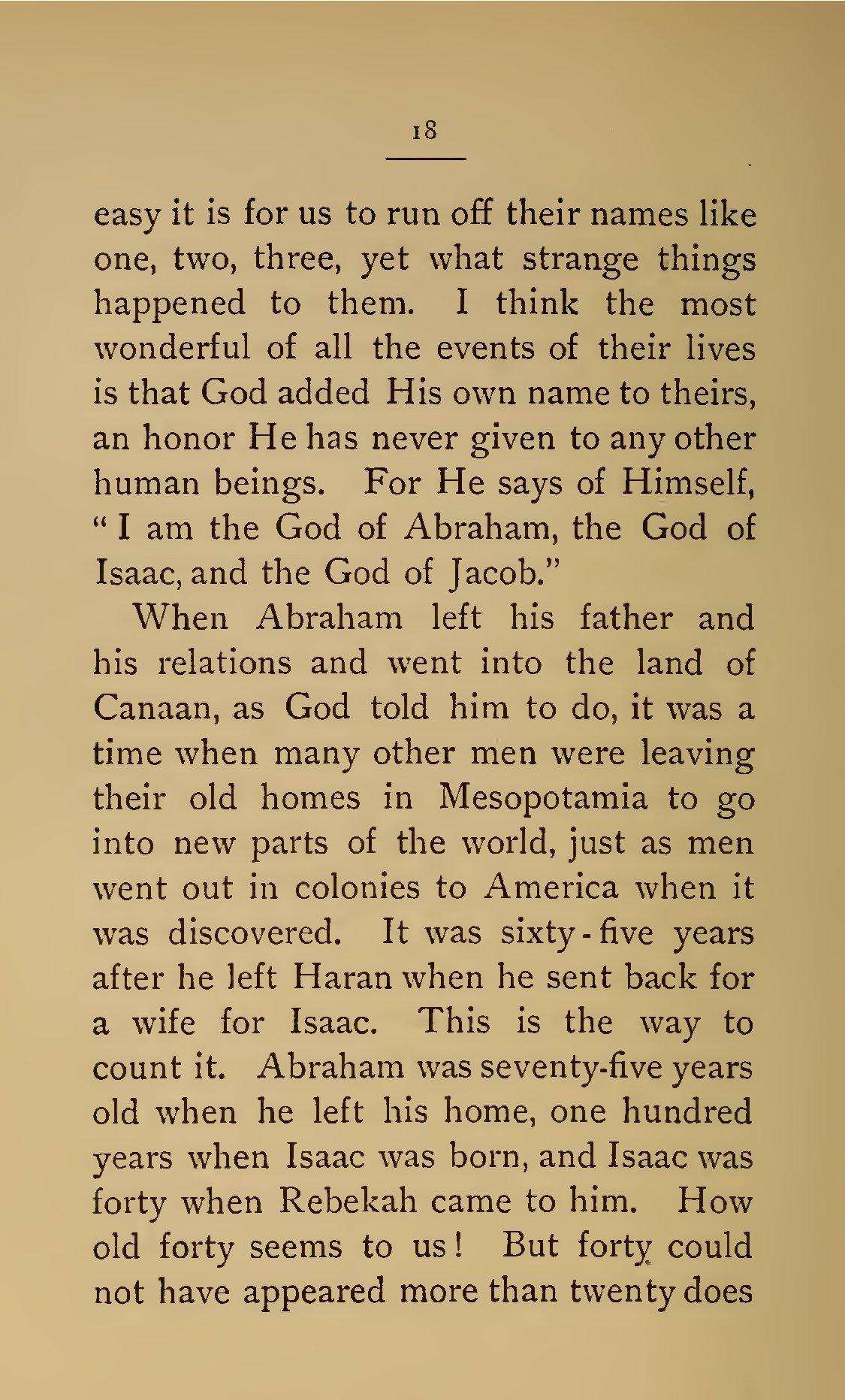 - 18 easy it is for us to run off their names like one, two, three, yet what strange things happened to them. I think the most wonderful of all the events of their lives is that God added His own name to theirs, an honor He has never given to any other human beings. For He says of Himself, “I am the God of Abraham, the God of Isaac, and the God of Jacob.” When Abraham left his father and his relations and went into the land of Canaan, as God told him to do, it was a time when many other men were leaving their old homes in Mesopotamia to go into new parts of the world, just as men went out in colonies to America when it was discovered. It was sixty-five years after he left Haran when he sent back for a wife for Isaac. This is the way to count it. Abraham was seventy-five years old when he left his home, one hundred years when Isaac was born, and Isaac was forty when Rebekah came to him. How old forty seems to us! But forty could not have appeared more than twenty does