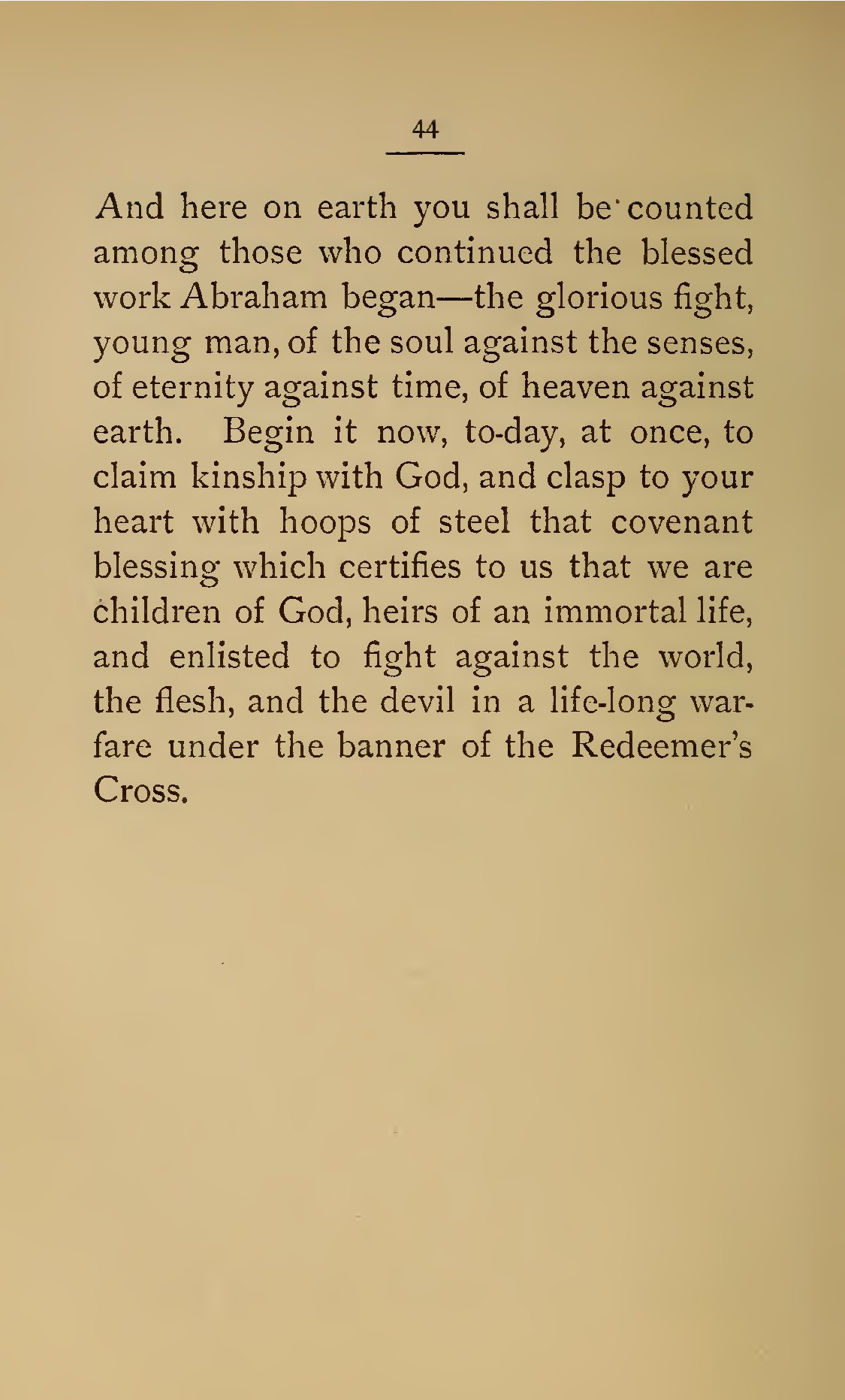 - 44 And here on earth you shall be counted among those who continued the blessed work Abraham began—the glorious fight, young man, of the soul against the senses, of eternity against time, of heaven against earth. Begin it now, to-day, at once, to claim kinship with God, and clasp to your heart with hoops of steel that covenant blessing which certifies to us that we are children of God, heirs of an immortal life, and enlisted to fight against the world, the flesh, and the devil in a life-long warfare under the banner of the Redeemer’s Cross.