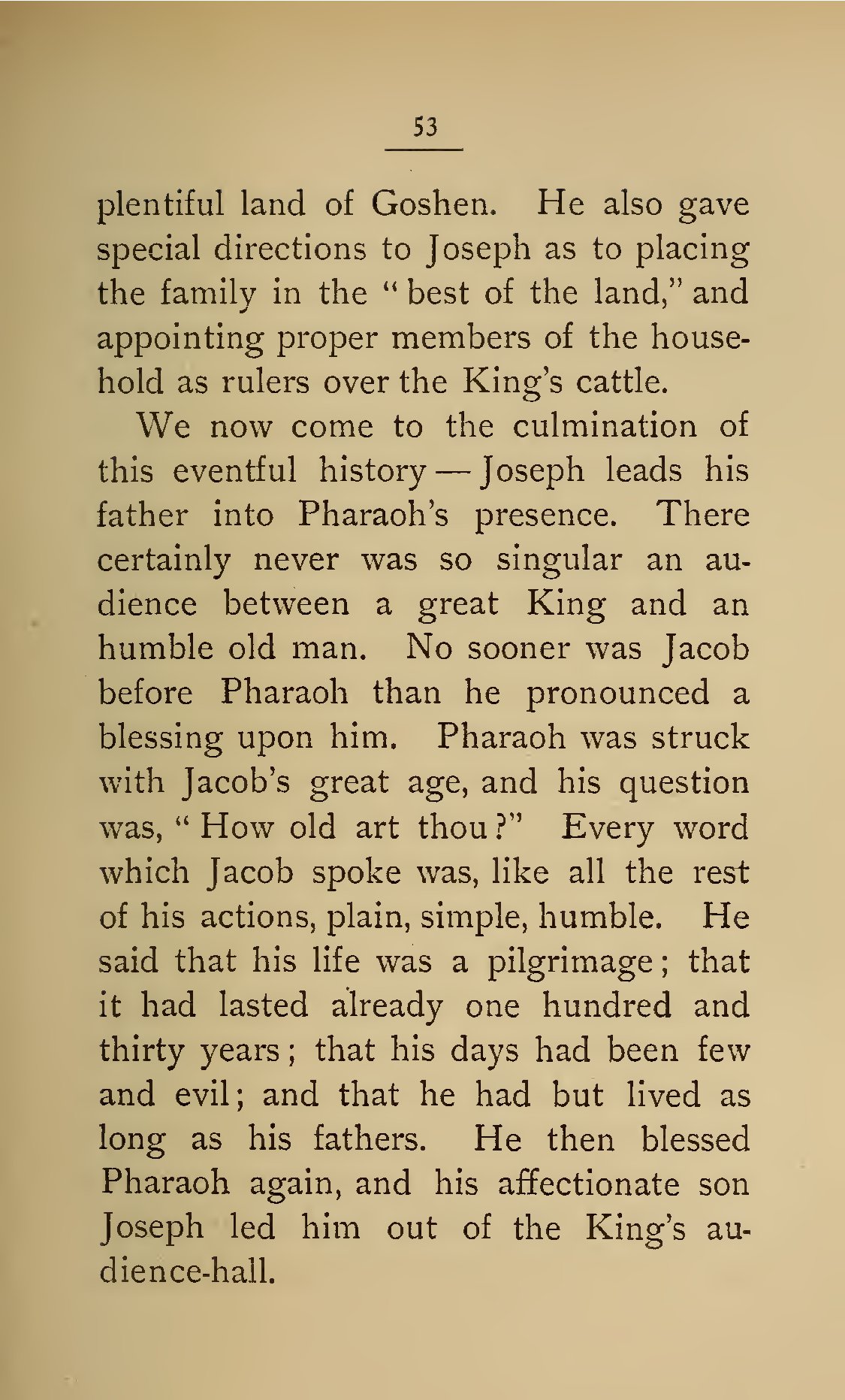 - 53 plentiful land of Goshen. He also gave special directions to Joseph as to placing the family in the “best of the land,” and appointing proper members of the household as rulers over the King’s cattle. We now come to the culmination of this eventful history—Joseph leads his father into Pharaoh’s presence. There certainly never was so singular an audience between a great King and an humble old man. No sooner was Jacob before Pharaoh than he pronounced a blessing upon him. Pharaoh was struck with Jacob’s great age, and his question was, “How old art thou?” Every word which Jacob spoke was, like all the rest of his actions, plain, simple, humble. He said that his life was a pilgrimage; that it had lasted already one hundred and thirty years; that his days had been few and evil; and that he had but lived as long as his fathers. He then blessed Pharaoh again, and his affectionate son Joseph led him out of the King’s audience-hall.