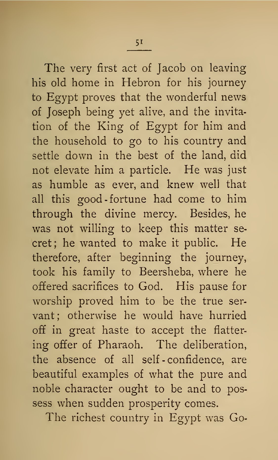 - 51 The very first act of Jacob on leaving his old home in Hebron for his journey to Egypt proves that the wonderful news of Joseph being yet alive, and the invitation of the King of Egypt for him and the household to go to his country and settle down in the best of the land, did not elevate him a particle. He was just as humble as ever, and knew well that all this good-fortune had come to him through the divine mercy. Besides, he was not willing to keep this matter secret; he wanted to make it public. He therefore, after beginning the journey, took his family to Beersheba, where he offered sacrifices to God. His pause for worship proved him to be the true servant; otherwise he would have hurried off in great haste to accept the flattering offer of Pharaoh. The deliberation, the absence of all self-confidence, are beautiful examples of what the pure and noble character ought to be and to possess when sudden prosperity comes. The richest country in Egypt was Go-