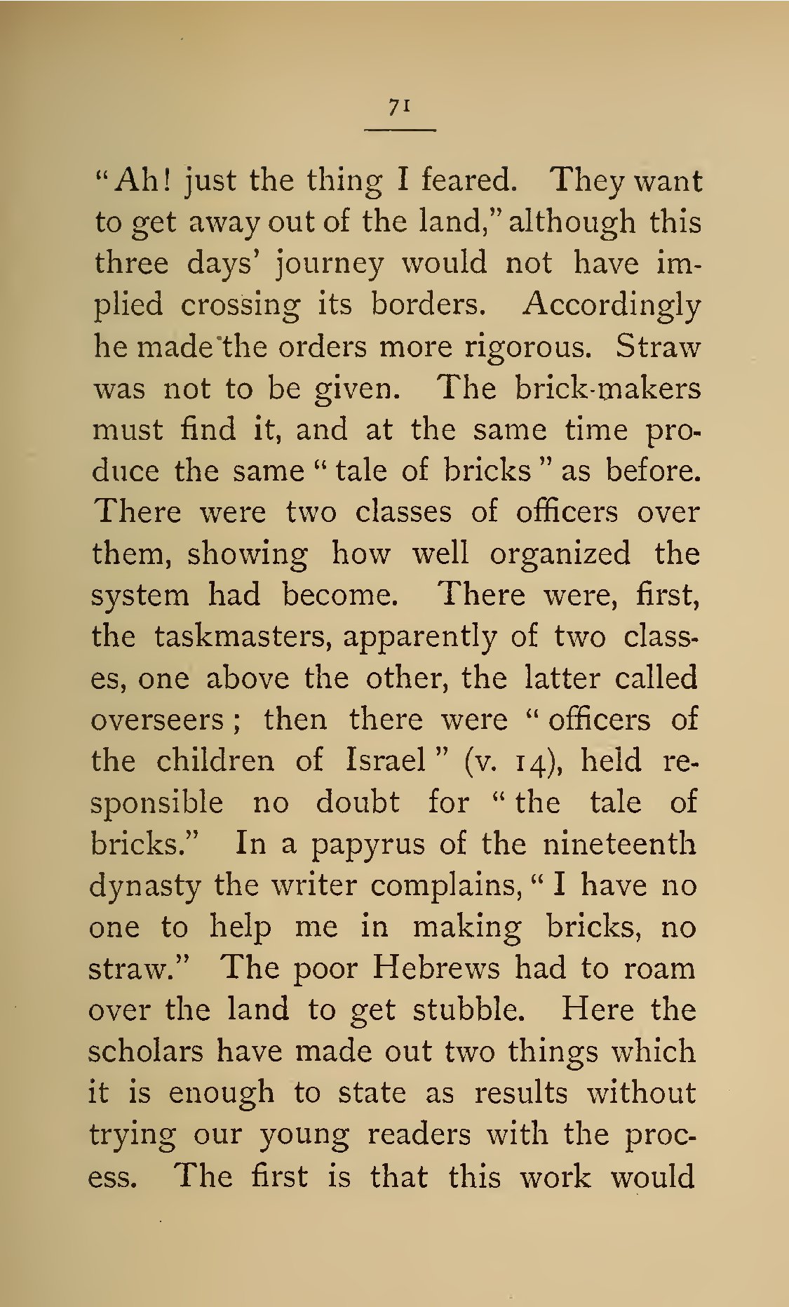 - 71 “Ah! just the thing I feared. They want to get away out of the land,” although this three days’ journey would not have implied crossing its borders. Accordingly he made the orders more rigorous. Straw was not to be given. The brick-makers must find it, and at the same time produce the same “tale of bricks” as before. There were two classes of officers over them, showing how well organized the system had become. There were, first, the taskmasters, apparently of two classes, one above the other, the latter called overseers; then there were “officers of the children of Israel” (v. 14), held responsible no doubt for “the tale of bricks.” In a papyrus of the nineteenth dynasty the writer complains, “I have no one to help me in making bricks, no straw.” The poor Hebrews had to roam over the land to get stubble. Here the scholars have made out two things which it is enough to state as results without trying our young readers with the process. The first is that this work would