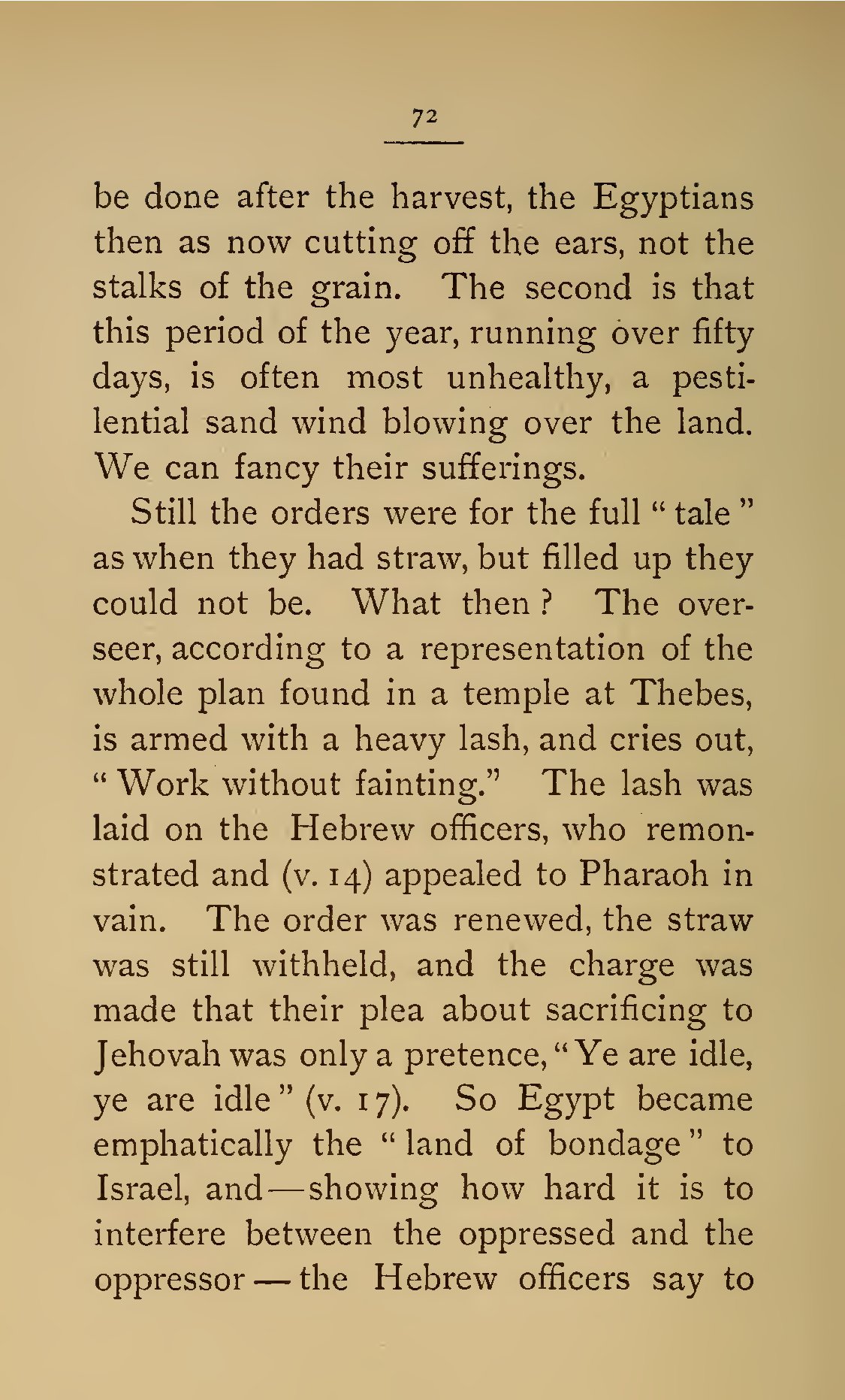 - 72 be done after the harvest, the Egyptians then as now cutting off the ears, not the stalks of the grain. The second is that this period of the year, running over fifty days, is often most unhealthy, a pestilential sand wind blowing over the land. We can fancy their sufferings. Still the orders were for the full “tale” as when they had straw, but filled up they could not be. What then? The overseer, according to a representation of the whole plan found in a temple at Thebes, is armed with a heavy lash, and cries out, “Work without fainting.” The lash was laid on the Hebrew officers, who remonstrated and (v. 14) appealed to Pharaoh in vain. The order was renewed, the straw was still withheld, and the charge was made that their plea about sacrificing to Jehovah was only a pretence, “Ye are idle, ye are idle” (v. 17). So Egypt became emphatically the “land of bondage” to Israel, and—showing how hard it is to interfere between the oppressed and the oppressor—the Hebrew officers say to