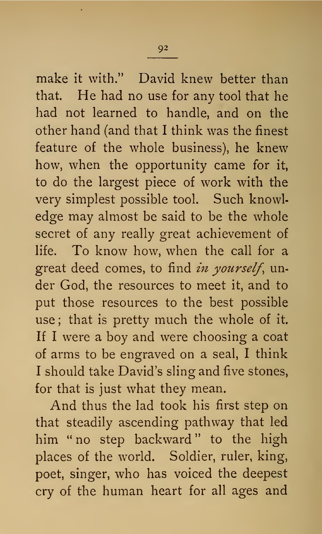 - 92 make it with.” David knew better than that. He had no use for any tool that he had not learned to handle, and on the other hand (and that I think was the finest feature of the whole business), he knew how, when the opportunity came for it, to do the largest piece of work with the very simplest possible tool. Such knowledge may almost be said to be the whole secret of any really great achievement of life. To know how, when the call for a great deed comes, to find *in yourself*, under God, the resources to meet it, and to put those resources to the best possible use; that is pretty much the whole of it. If I were a boy and were choosing a coat of arms to be engraved on a seal, I think I should take David’s sling and five stones, for that is just what they mean. And thus the lad took his first step on that steadily ascending pathway that led him “no step backward” to the high places of the world. Soldier, ruler, king, poet, singer, who has voiced the deepest cry of the human heart for all ages and