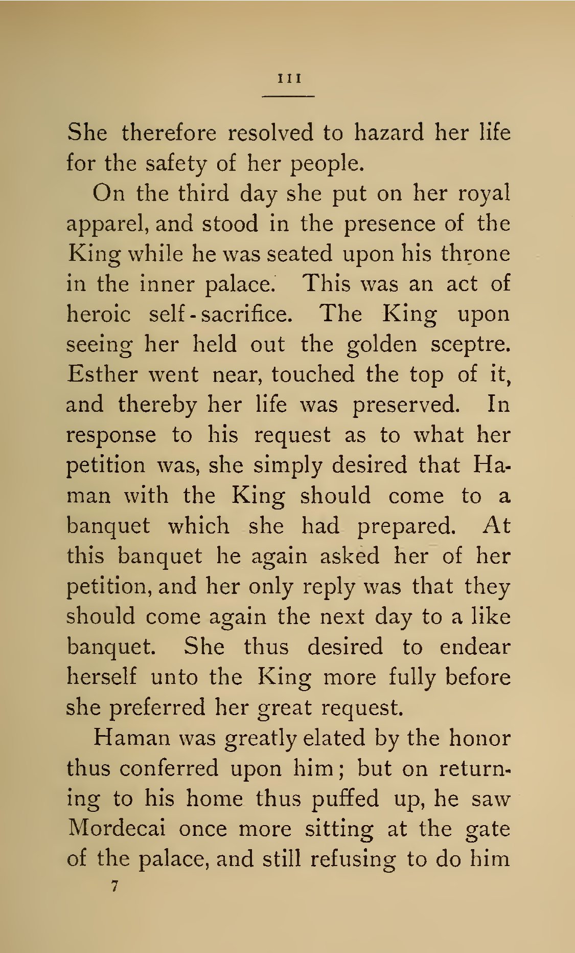 - III She therefore resolved to hazard her life for the safety of her people. On the third day she put on her royal apparel, and stood in the presence of the King while he was seated upon his throne in the inner palace. This was an act of heroic self-sacrifice. The King upon seeing her held out the golden sceptre. Esther went near, touched the top of it, and thereby her life was preserved. In response to his request as to what her petition was, she simply desired that Haman with the King should come to a banquet which she had prepared. At this banquet he again asked her of her petition, and her only reply was that they should come again the next day to a like banquet. She thus desired to endear herself unto the King more fully before she preferred her great request. Haman was greatly elated by the honor thus conferred upon him; but on returning to his home thus puffed up, he saw Mordecai once more sitting at the gate of the palace, and still refusing to do him 7