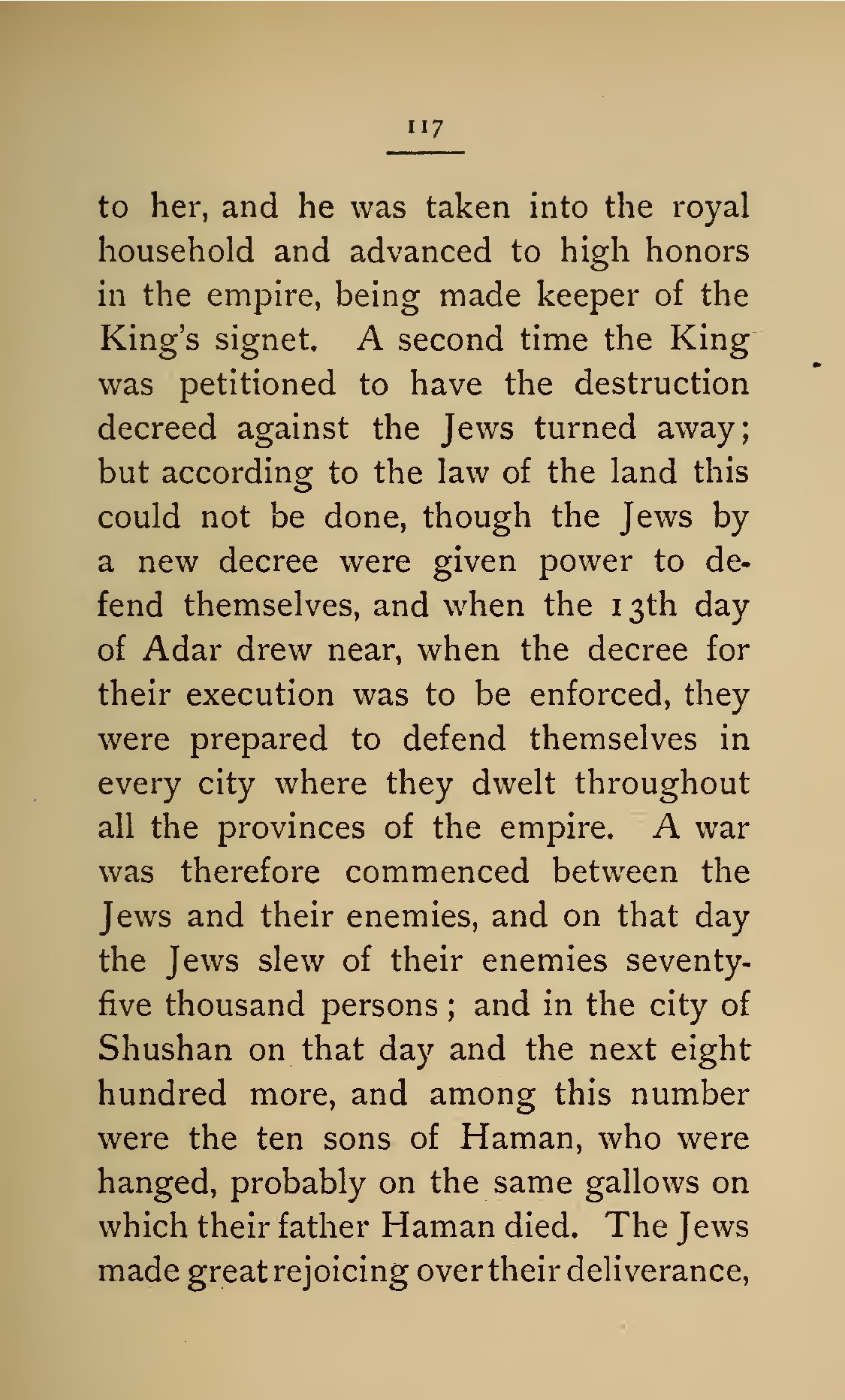 - 117 to her, and he was taken into the royal household and advanced to high honors in the empire, being made keeper of the King's signet. A second time the King was petitioned to have the destruction decreed against the Jews turned away; but according to the law of the land this could not be done, though the Jews by a new decree were given power to defend themselves, and when the 13th day of Adar drew near, when the decree for their execution was to be enforced, they were prepared to defend themselves in every city where they dwelt throughout all the provinces of the empire. A war was therefore commenced between the Jews and their enemies, and on that day the Jews slew of their enemies seventy-five thousand persons; and in the city of Shushan on that day and the next eight hundred more, and among this number were the ten sons of Haman, who were hanged, probably on the same gallows on which their father Haman died. The Jews made great rejoicing over their deliverance,