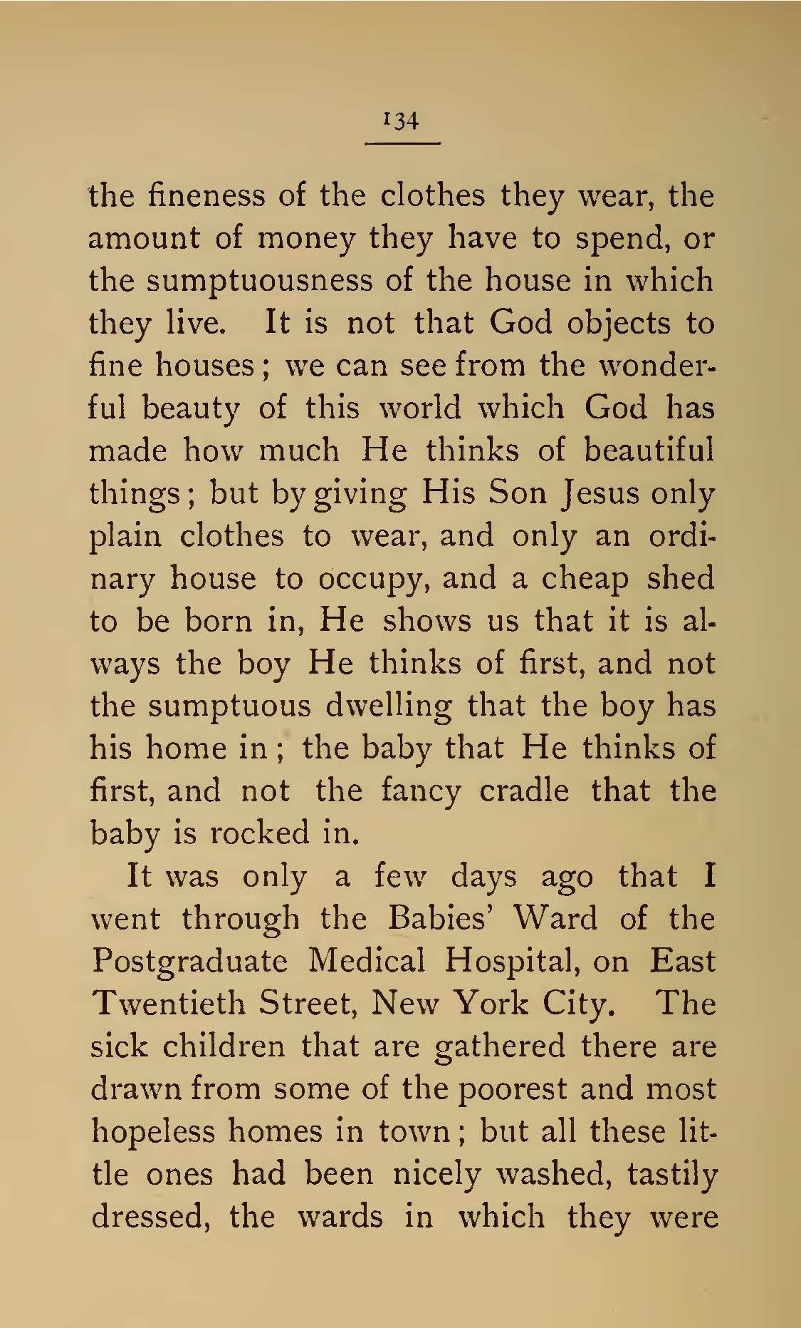 - 134 the fineness of the clothes they wear, the amount of money they have to spend, or the sumptuousness of the house in which they live. It is not that God objects to fine houses; we can see from the wonderful beauty of this world which God has made how much He thinks of beautiful things; but by giving His Son Jesus only plain clothes to wear, and only an ordinary house to occupy, and a cheap shed to be born in, He shows us that it is always the boy He thinks of first, and not the sumptuous dwelling that the boy has his home in; the baby that He thinks of first, and not the fancy cradle that the baby is rocked in. It was only a few days ago that I went through the Babies’ Ward of the Postgraduate Medical Hospital, on East Twentieth Street, New York City. The sick children that are gathered there are drawn from some of the poorest and most hopeless homes in town; but all these little ones had been nicely washed, tastily dressed, the wards in which they were