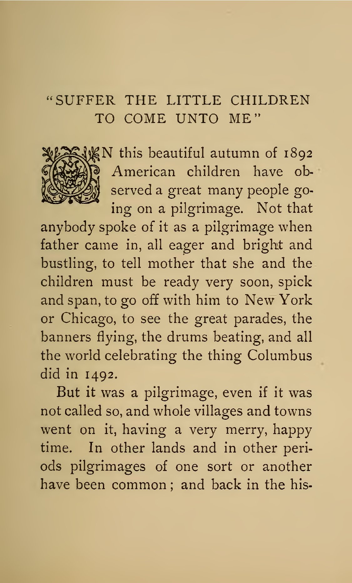 - # "SUFFER THE LITTLE CHILDREN TO COME UNTO ME"  N this beautiful autumn of 1892 American children have observed a great many people going on a pilgrimage. Not that anybody spoke of it as a pilgrimage when father came in, all eager and bright and bustling, to tell mother that she and the children must be ready very soon, spick and span, to go off with him to New York or Chicago, to see the great parades, the banners flying, the drums beating, and all the world celebrating the thing Columbus did in 1492. But it was a pilgrimage, even if it was not called so, and whole villages and towns went on it, having a very merry, happy time. In other lands and in other periods pilgrimages of one sort or another have been common; and back in the his-