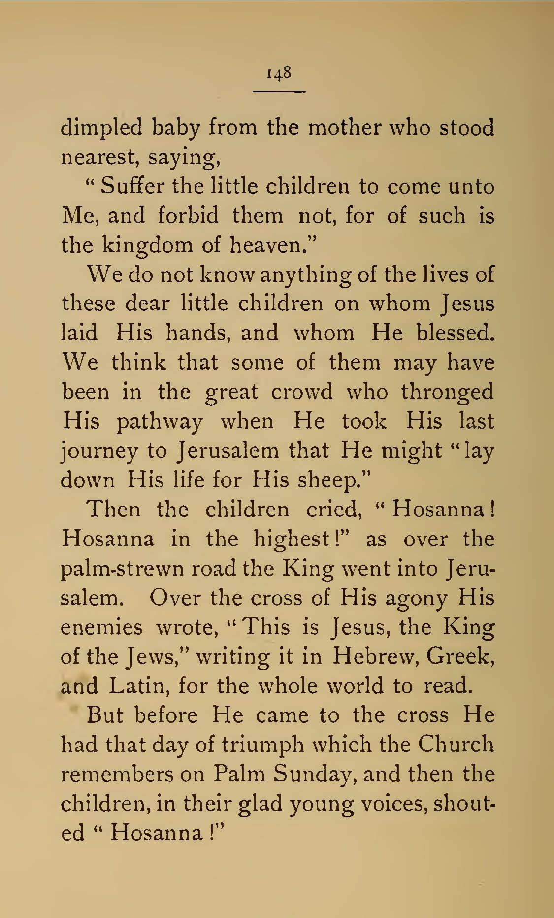 - 148 dimpled baby from the mother who stood nearest, saying, “Suffer the little children to come unto Me, and forbid them not, for of such is the kingdom of heaven.” We do not know anything of the lives of these dear little children on whom Jesus laid His hands, and whom He blessed. We think that some of them may have been in the great crowd who thronged His pathway when He took His last journey to Jerusalem that He might “lay down His life for His sheep.” Then the children cried, “Hosanna! Hosanna in the highest!” as over the palm-strewn road the King went into Jerusalem. Over the cross of His agony His enemies wrote, “This is Jesus, the King of the Jews,” writing it in Hebrew, Greek, and Latin, for the whole world to read. “But before He came to the cross He had that day of triumph which the Church remembers on Palm Sunday, and then the children, in their glad young voices, shouted “Hosanna!”