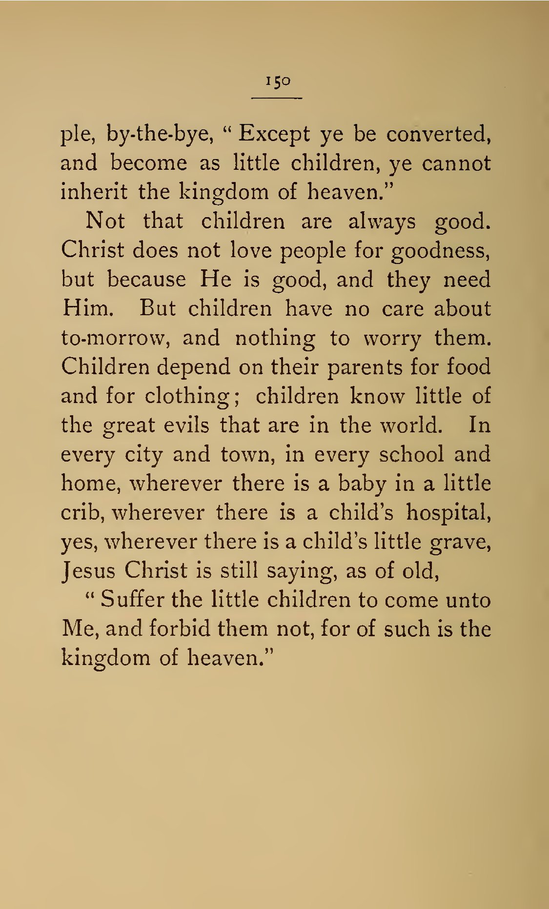 - 150 ple, by-the-bye, “Except ye be converted, and become as little children, ye cannot inherit the kingdom of heaven.” Not that children are always good. Christ does not love people for goodness, but because He is good, and they need Him. But children have no care about to-morrow, and nothing to worry them. Children depend on their parents for food and for clothing; children know little of the great evils that are in the world. In every city and town, in every school and home, wherever there is a baby in a little crib, wherever there is a child’s hospital, yes, wherever there is a child’s little grave, Jesus Christ is still saying, as of old, “Suffer the little children to come unto Me, and forbid them not, for of such is the kingdom of heaven.”