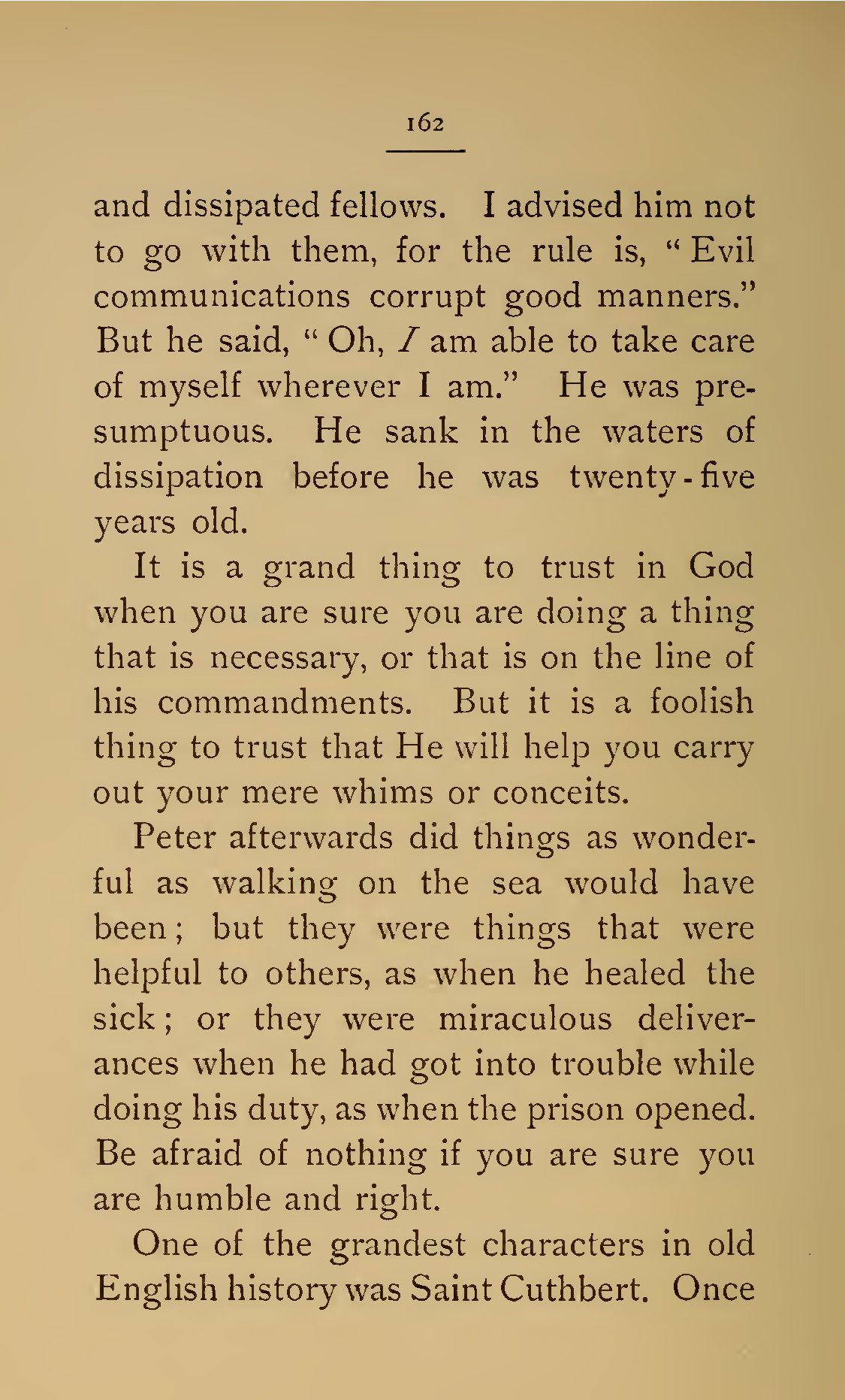 - 162 and dissipated fellows. I advised him not to go with them, for the rule is, “Evil communications corrupt good manners.” But he said, “Oh, I am able to take care of myself wherever I am.” He was presumptuous. He sank in the waters of dissipation before he was twenty-five years old. It is a grand thing to trust in God when you are sure you are doing a thing that is necessary, or that is on the line of his commandments. But it is a foolish thing to trust that He will help you carry out your mere whims or conceits. Peter afterwards did things as wonderful as walking on the sea would have been; but they were things that were helpful to others, as when he healed the sick; or they were miraculous deliverances when he had got into trouble while doing his duty, as when the prison opened. Be afraid of nothing if you are sure you are humble and right. One of the grandest characters in old English history was Saint Cuthbert. Once