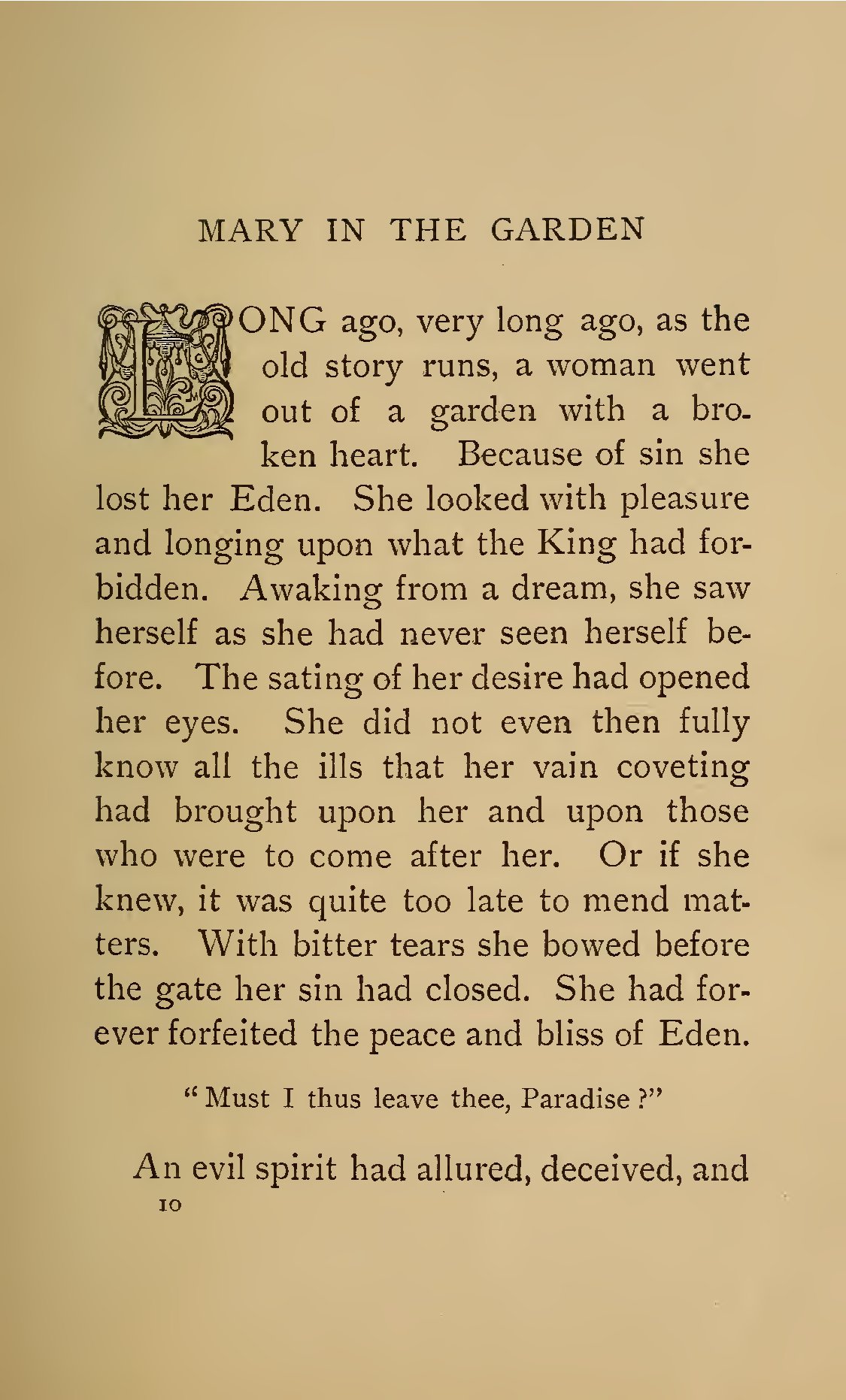 - # MARY IN THE GARDEN  ONG ago, very long ago, as the old story runs, a woman went out of a garden with a broken heart. Because of sin she lost her Eden. She looked with pleasure and longing upon what the King had forbidden. Awaking from a dream, she saw herself as she had never seen herself before. The sating of her desire had opened her eyes. She did not even then fully know all the ills that her vain coveting had brought upon her and upon those who were to come after her. Or if she knew, it was quite too late to mend matters. With bitter tears she bowed before the gate her sin had closed. She had forever forfeited the peace and bliss of Eden. “Must I thus leave thee, Paradise?” An evil spirit had allured, deceived, and 10