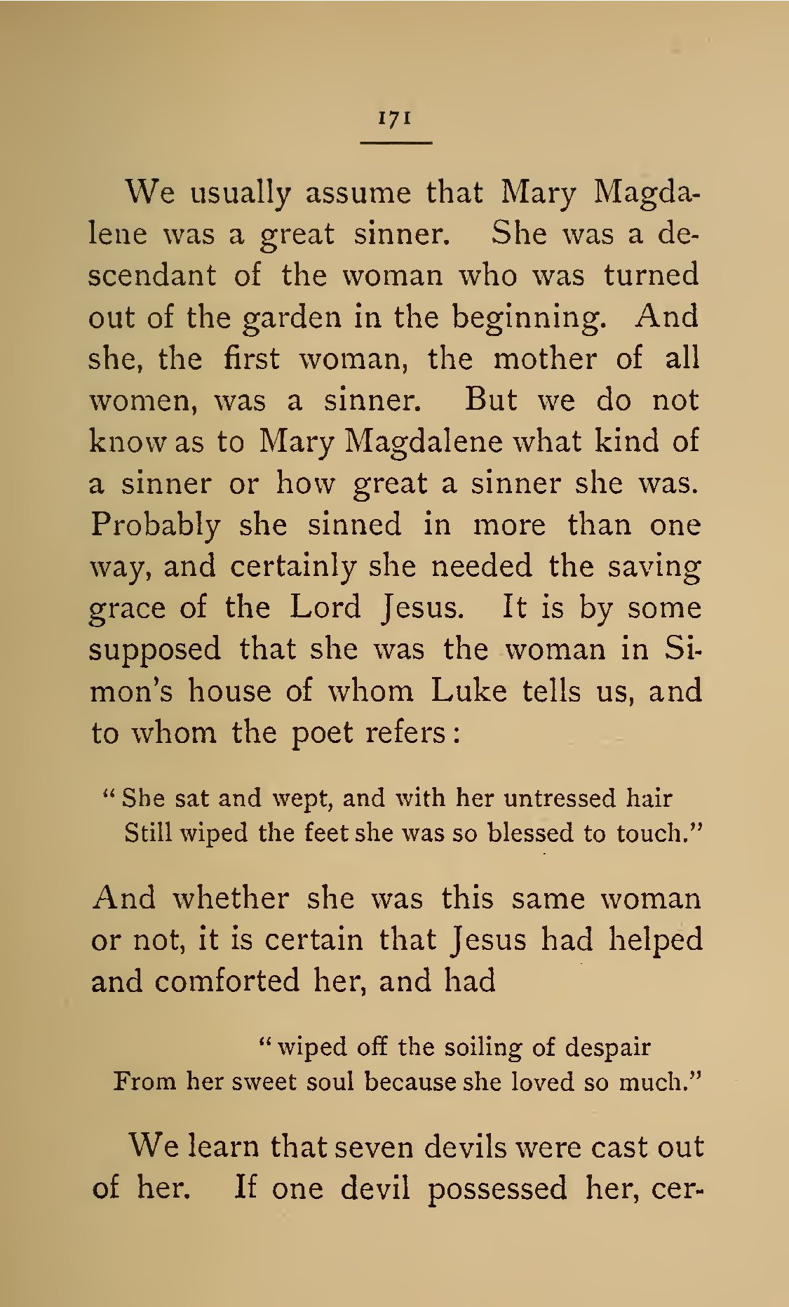 - 171 We usually assume that Mary Magdalene was a great sinner. She was a descendant of the woman who was turned out of the garden in the beginning. And she, the first woman, the mother of all women, was a sinner. But we do not know as to Mary Magdalene what kind of a sinner or how great a sinner she was. Probably she sinned in more than one way, and certainly she needed the saving grace of the Lord Jesus. It is by some supposed that she was the woman in Simon’s house of whom Luke tells us, and to whom the poet refers: > “She sat and wept, and with her untressed hair > Still wiped the feet she was so blessed to touch.” And whether she was this same woman or not, it is certain that Jesus had helped and comforted her, and had > “wiped off the soiling of despair > From her sweet soul because she loved so much.” We learn that seven devils were cast out of her. If one devil possessed her, cer-
