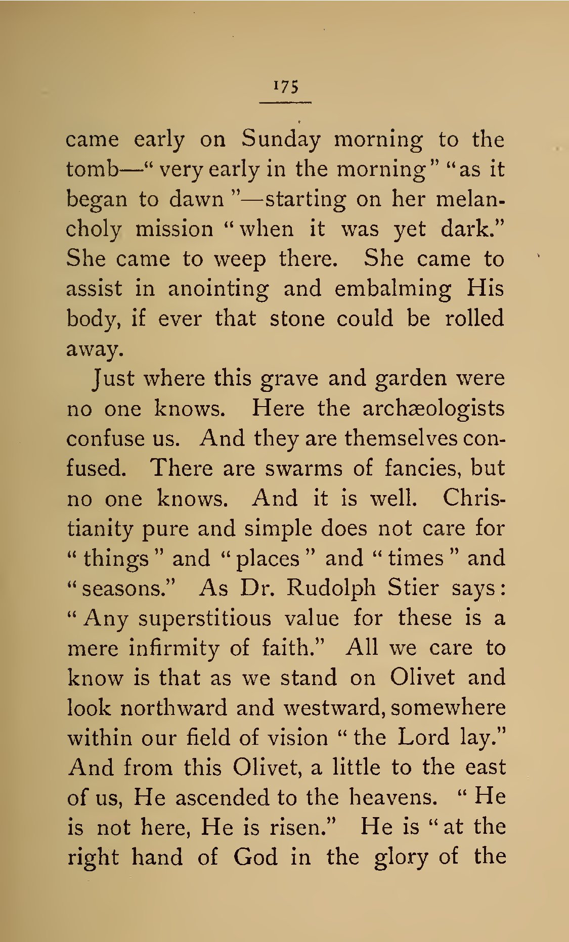 - 175 came early on Sunday morning to the tomb—“very early in the morning” “as it began to dawn”—starting on her melancholy mission “when it was yet dark.” She came to weep there. She came to assist in anointing and embalming His body, if ever that stone could be rolled away. Just where this grave and garden were no one knows. Here the archæologists confuse us. And they are themselves confused. There are swarms of fancies, but no one knows. And it is well. Christianity pure and simple does not care for “things” and “places” and “times” and “seasons.” As Dr. Rudolph Stier says: “Any superstitious value for these is a mere infirmity of faith.” All we care to know is that as we stand on Olivet and look northward and westward, somewhere within our field of vision “the Lord lay.” And from this Olivet, a little to the east of us, He ascended to the heavens. “He is not here, He is risen.” He is “at the right hand of God in the glory of the