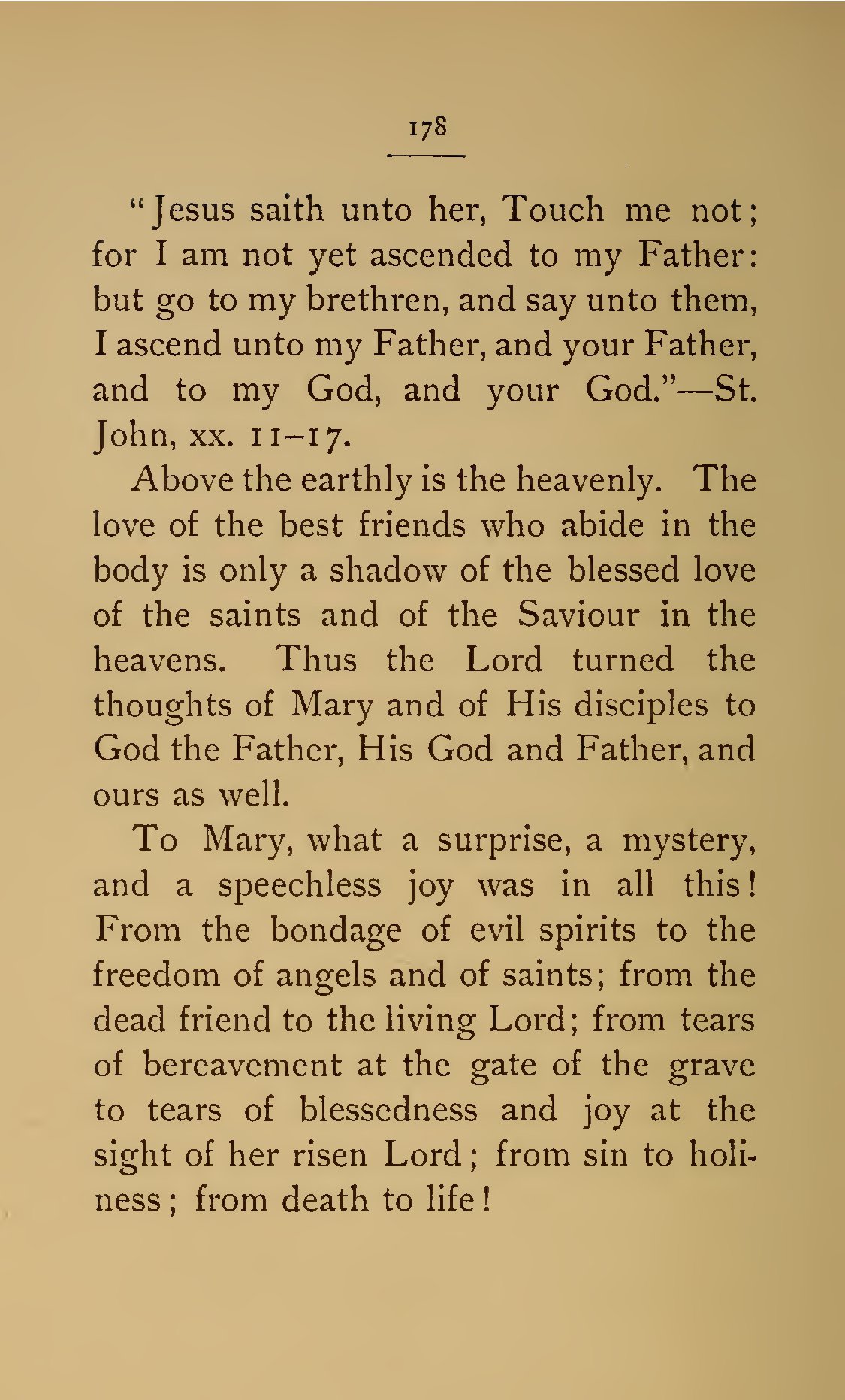 - 178 “Jesus saith unto her, Touch me not; for I am not yet ascended to my Father: but go to my brethren, and say unto them, I ascend unto my Father, and your Father, and to my God, and your God.”—St. John, xx. 11–17. Above the earthly is the heavenly. The love of the best friends who abide in the body is only a shadow of the blessed love of the saints and of the Saviour in the heavens. Thus the Lord turned the thoughts of Mary and of His disciples to God the Father, His God and Father, and ours as well. To Mary, what a surprise, a mystery, and a speechless joy was in all this! From the bondage of evil spirits to the freedom of angels and of saints; from the dead friend to the living Lord; from tears of bereavement at the gate of the grave to tears of blessedness and joy at the sight of her risen Lord; from sin to holiness; from death to life!