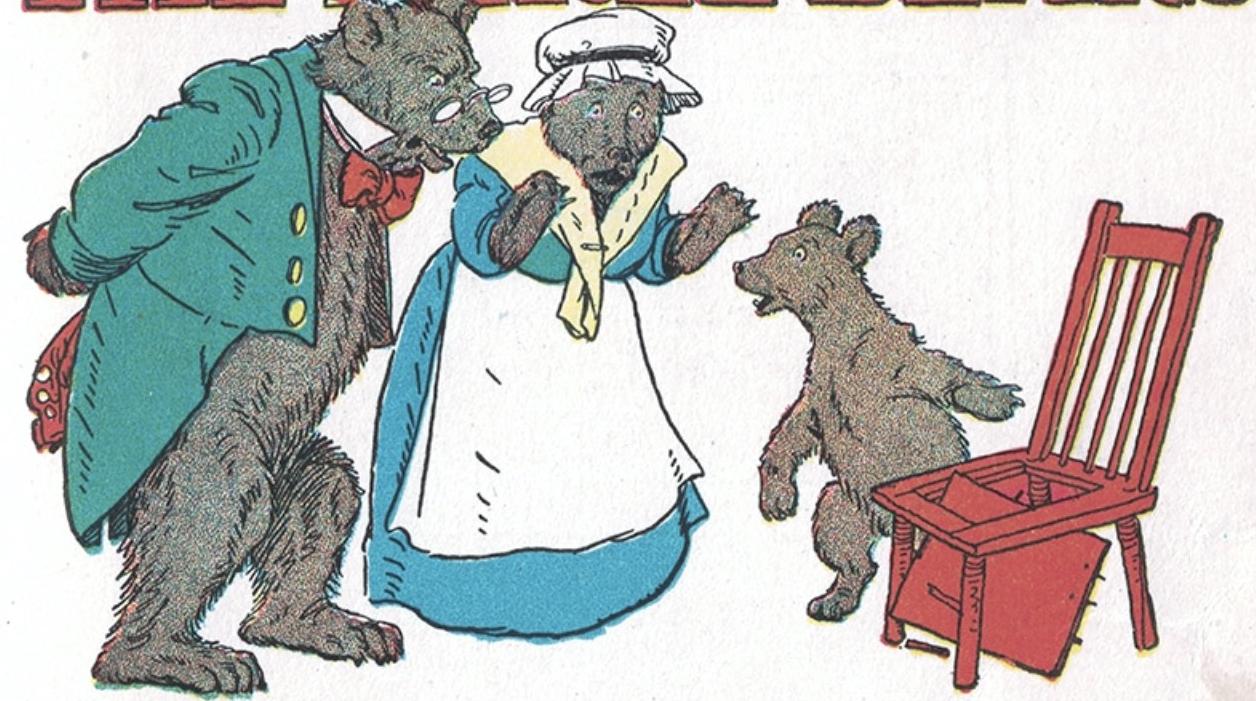 - This image is an illustration depicting a scene from the fairy tale "The Three Bears." It features three anthropomorphic bears and a broken red wooden chair, set against a plain white background. From left to right: * **Papa Bear** stands on two legs, facing right, with a stern expression. He is dark brown and wears spectacles, a teal-blue jacket with three yellow buttons, and a red bow tie. A red pouch or bag hangs from his left hip. * **Mama Bear** stands in the center, looking towards the right with an expression of concern or surprise. She is dark brown and wears a white bonnet, a light blue dress with long sleeves, and a white apron with a yellow collar. * **Baby Bear** stands to the right, slightly smaller than the other two, with an open mouth suggesting surprise or distress. He is light brown and appears to be gesturing towards the broken chair with his left paw. The red wooden chair, positioned to the right of Baby Bear, has its seat completely broken, with a piece of the seat falling out from underneath. This illustration is extracted from the larger file, [The Three Bears](arke:01KJQNX7HJX44Q3VAQZ43AJQDH), and is part of the collection titled [Three Bears Test 1772468738398](arke:01KJQNX6GVEEG1CYX2X68W4YGC).