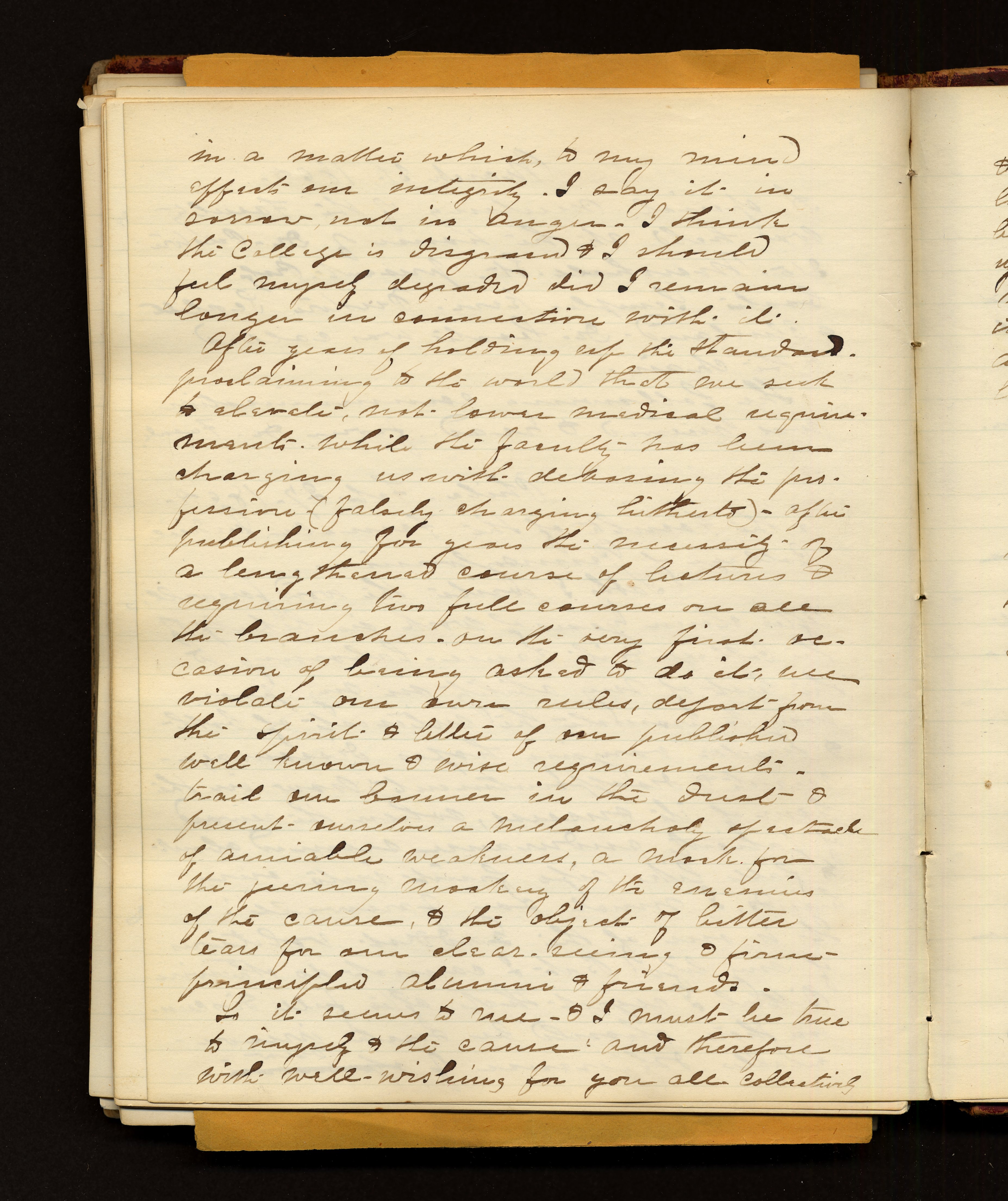 - in a matter which, to my mind effects our integrity. I say it in sorrow not in anger. I think the College is disgraceful & I should feel myself degraded did I remain longer in connection with it. After years of holding up the standard proclaiming to the world that we seek to elevate, not lower medical requirements. While the faculty has been charging us with debasing the profession (falsely charging hitherto) - after publishing for years the necessity of a lengthened course of lectures & requiring two full courses on all the branches. On the very first occasion of being asked to do it, we violate our own rules, depart from the spirit & letter of our publisher well known & wise requirements. trial our banners in the dust & present ourselves a melancholy of extracts of amiable weakness, a mark for the pering mockery of the enemies of the cause, & the object of bitter tears for our clear seeing & firm principled aluminum & friends. Is it seems to me - & I must be true to myself & the cause and therefore with well-wishing for you all collective