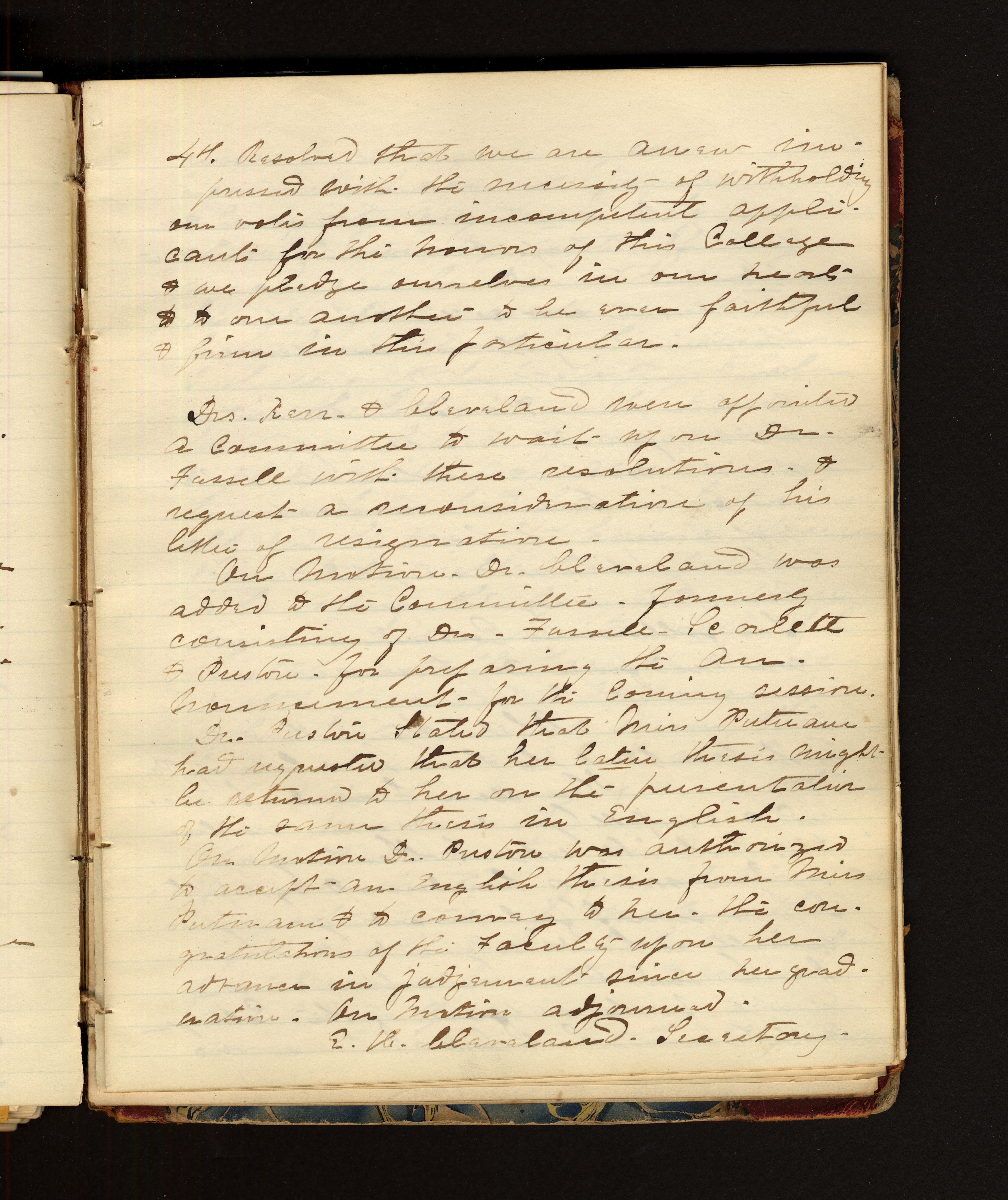 - 4th. Resolved that we are anew imposed with the necessity of withholding our votes from incompetent applicants for the honors of this College & we pledge ourselves in our heart to our another to be ever faithful to him in this particular. Dr. Kerr & Cleveland were appointed a committee to wait upon Dr. Farrell with these resolutions & request a reconsideration of his letter of resignation. On motion Dr. Cleveland was added to the committee - formerly consisting of Drs. Farrell, Ferrett & Preston - for preparing the am. Government - for the coming session. Dr. Preston stated that Miss Putnam had requested that her letter should be returned to her on the presentation of the same thesis in English. On motion Dr. Preston was authorized to accept an English thesis from Miss Putnam & to convey to her the congratulations of the faculty upon her advance in judgement since her graduation. On motion adjourned. E. W. Cleveland, Secretary