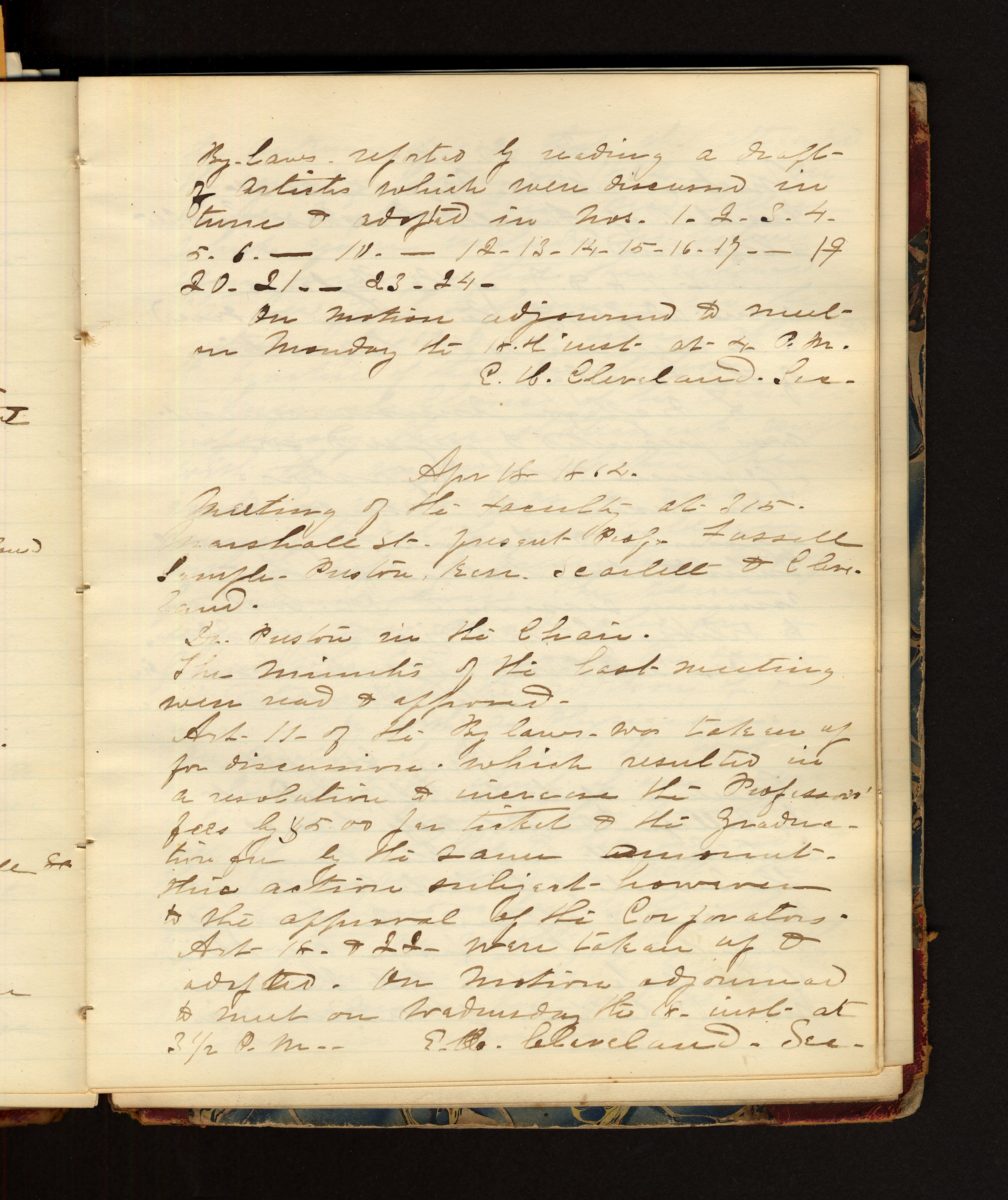 - By laws reported by reading a draft of articles which were discussed in time & adopted in Nos. 1. 2. 3. 4. 5. 6. — 10. — 12-13-14-15-16-17 — 19 20. 21. — 23. 24. On motion adjourned to meet on Monday the 14th inst at 4 P.M. E.B. Cleveland, Sec. Apr 14 1462. Meeting of the Esculet at 315 Marshall St. present Prof. Lassell, Sample, Preston, Kerr, Scarell & Cleveland. 2nd. Preston in the Chain. The minutes of the last meeting were read & approved. Art. 11. of the By laws was taken up for discussion which resulted in a resolution & increase the Professors' fees by $500 for ticket & the graduation fee by the same amount. This action subject however to the approval of the Corporators. Art. 14. & 22 were taken up & adopted. On motion adjourned to meet on Wednesday the 14 inst at 3 1/2 P.M. E.B. Cleveland, Sec.