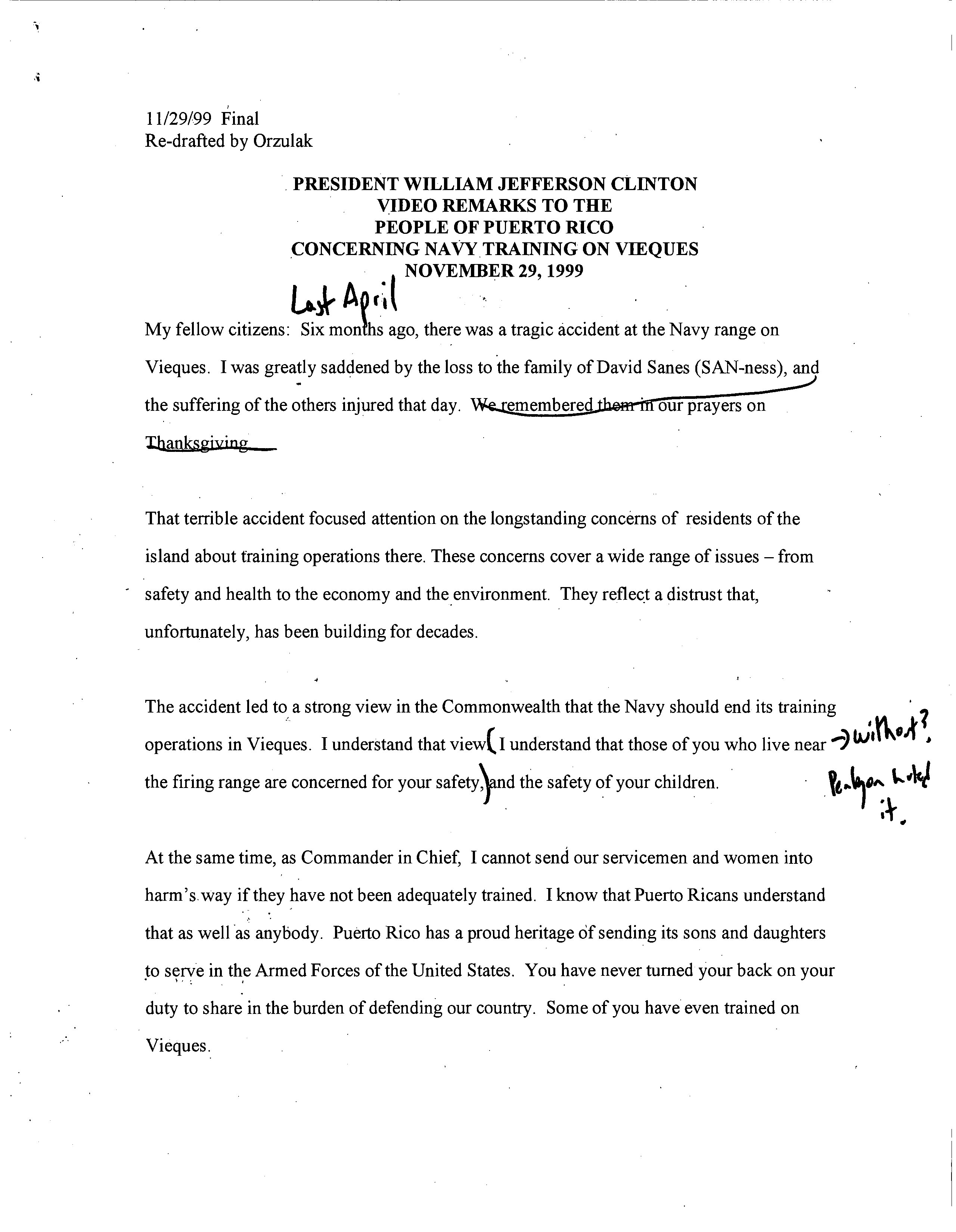 - 11/29/99 Final Re-drafted by Orzulak PRESIDENT WILLIAM JEFFERSON CLINTON VIDEO REMARKS TO THE PEOPLE OF PUERTO RICO CONCERNING NAVY TRAINING ON VIEQUES NOVEMBER 29, 1999 Last April My fellow citizens: Six months ago, there was a tragic accident at the Navy range on Vieques. I was greatly saddened by the loss to the family of David Sanes (SAN-ness), and the suffering of the others injured that day. We remembered them in our prayers on Thanksgiving. That terrible accident focused attention on the longstanding concerns of residents of the island about training operations there. These concerns cover a wide range of issues – from safety and health to the economy and the environment. They reflect a distrust that, unfortunately, has been building for decades. The accident led to a strong view in the Commonwealth that the Navy should end its training operations in Vieques. I understand that view. I understand that those of you who live near the firing range are concerned for your safety, and the safety of your children. At the same time, as Commander in Chief, I cannot send our servicemen and women into harm's way if they have not been adequately trained. I know that Puerto Ricans understand that as well as anybody. Puerto Rico has a proud heritage of sending its sons and daughters to serve in the Armed Forces of the United States. You have never turned your back on your duty to share in the burden of defending our country. Some of you have even trained on Vieques. → without? Penlyon looked it.