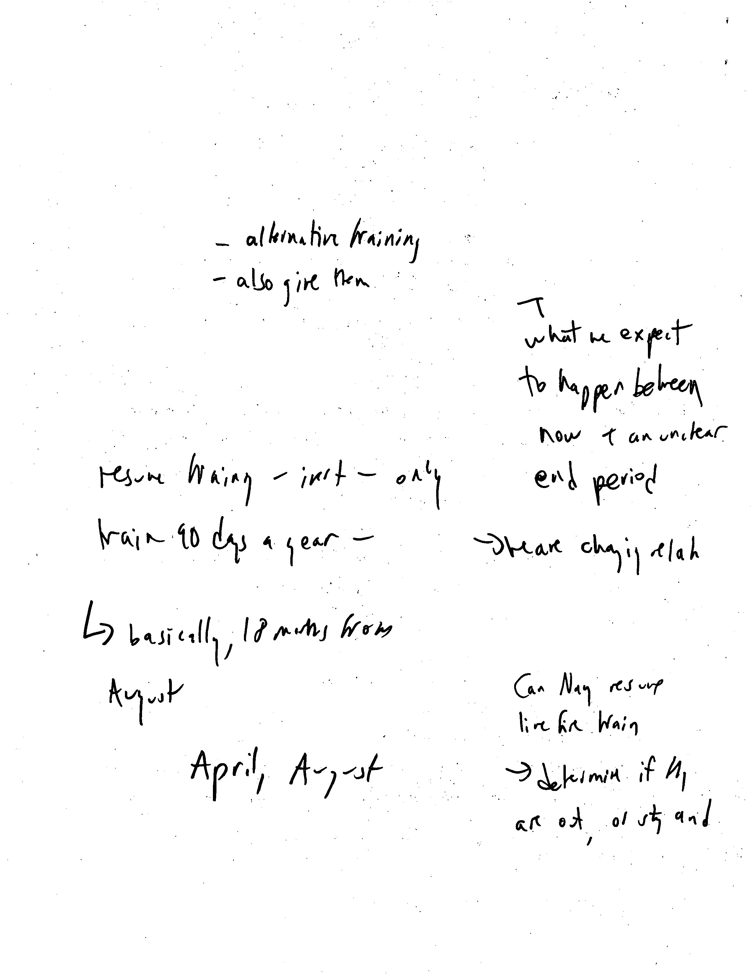 - - alternative training - also give them T what we expect to happen between now & an unclear end period Resume training - inert - only train 90 days a year → we are changing elah → basically, 18 months from August April, August Can Nay resume live for train → determine if N1 are out, or stay and