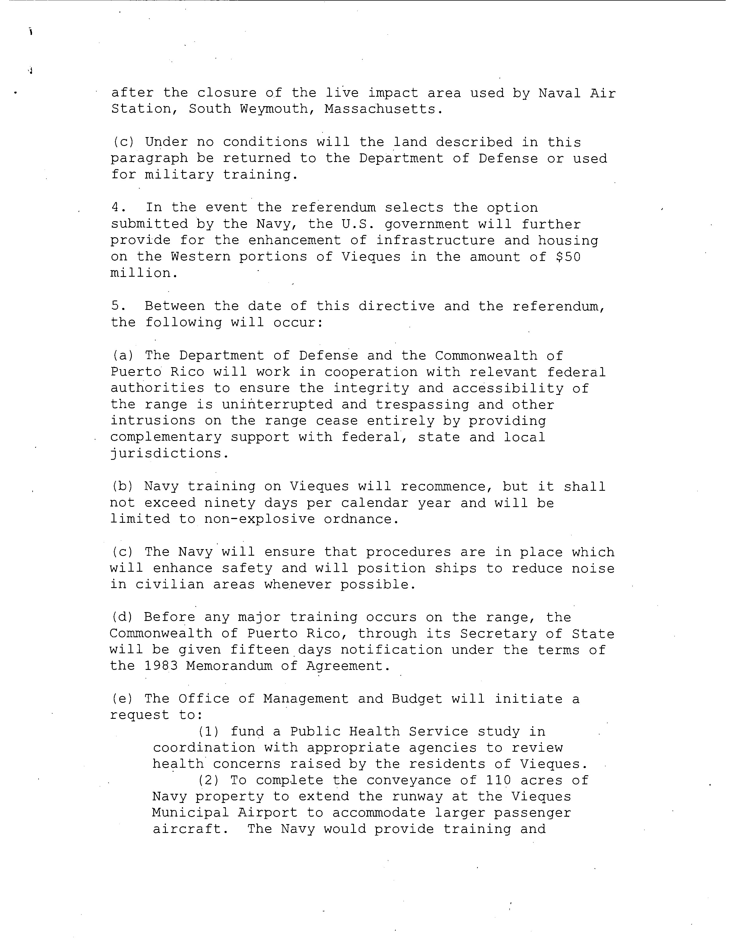 - after the closure of the live impact area used by Naval Air Station, South Weymouth, Massachusetts. (c) Under no conditions will the land described in this paragraph be returned to the Department of Defense or used for military training. 4. In the event the referendum selects the option submitted by the Navy, the U.S. government will further provide for the enhancement of infrastructure and housing on the Western portions of Vieques in the amount of $50 million. 5. Between the date of this directive and the referendum, the following will occur: (a) The Department of Defense and the Commonwealth of Puerto Rico will work in cooperation with relevant federal authorities to ensure the integrity and accessibility of the range is uninterrupted and trespassing and other intrusions on the range cease entirely by providing complementary support with federal, state and local jurisdictions. (b) Navy training on Vieques will recommence, but it shall not exceed ninety days per calendar year and will be limited to non-explosive ordnance. (c) The Navy will ensure that procedures are in place which will enhance safety and will position ships to reduce noise in civilian areas whenever possible. (d) Before any major training occurs on the range, the Commonwealth of Puerto Rico, through its Secretary of State will be given fifteen days notification under the terms of the 1983 Memorandum of Agreement. (e) The Office of Management and Budget will initiate a request to: (1) fund a Public Health Service study in coordination with appropriate agencies to review health concerns raised by the residents of Vieques. (2) To complete the conveyance of 110 acres of Navy property to extend the runway at the Vieques Municipal Airport to accommodate larger passenger aircraft. The Navy would provide training and