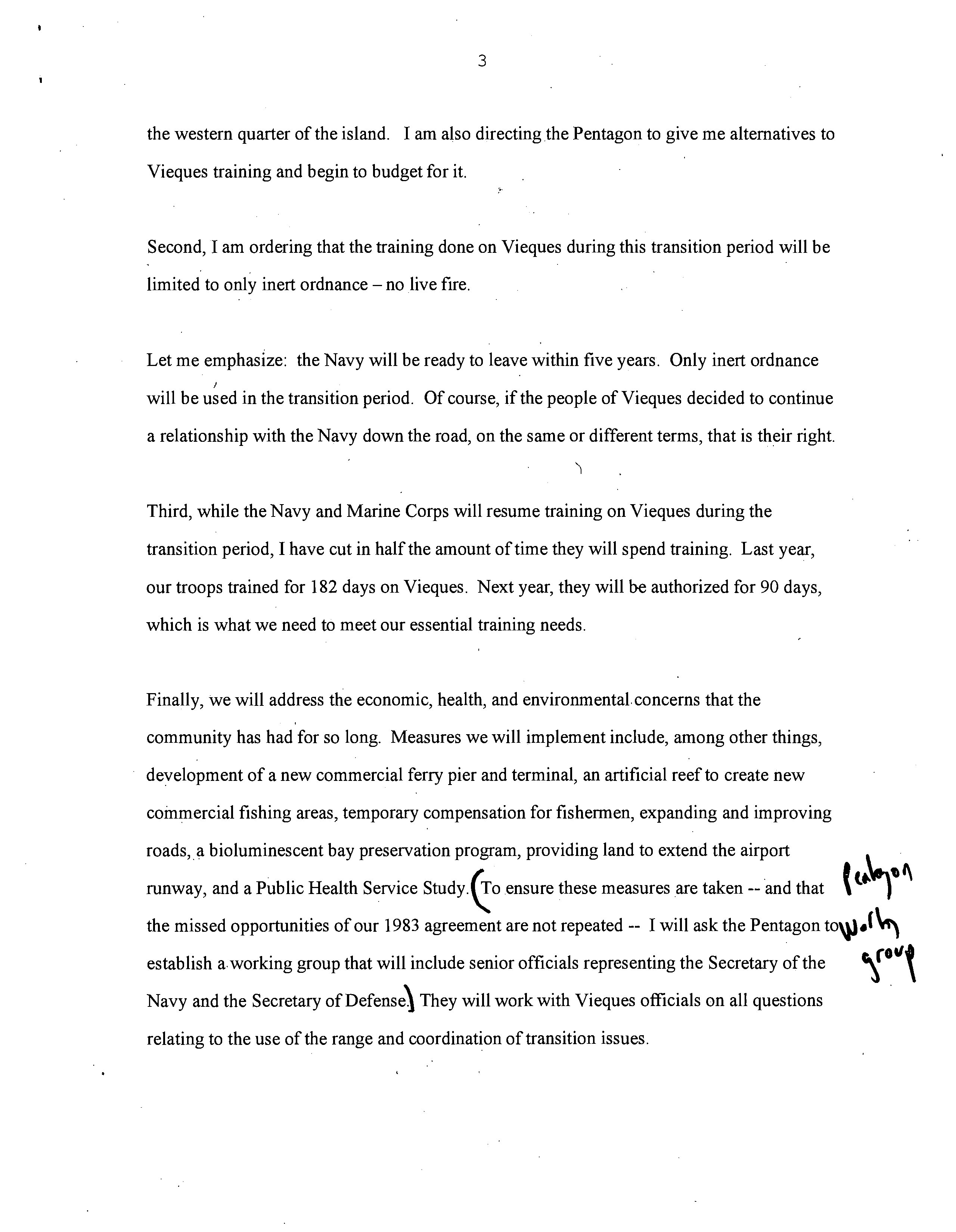 - 3 the western quarter of the island. I am also directing the Pentagon to give me alternatives to Vieques training and begin to budget for it. Second, I am ordering that the training done on Vieques during this transition period will be limited to only inert ordnance – no live fire. Let me emphasize: the Navy will be ready to leave within five years. Only inert ordnance will be used in the transition period. Of course, if the people of Vieques decided to continue a relationship with the Navy down the road, on the same or different terms, that is their right. Third, while the Navy and Marine Corps will resume training on Vieques during the transition period, I have cut in half the amount of time they will spend training. Last year, our troops trained for 182 days on Vieques. Next year, they will be authorized for 90 days, which is what we need to meet our essential training needs. Finally, we will address the economic, health, and environmental concerns that the community has had for so long. Measures we will implement include, among other things, development of a new commercial ferry pier and terminal, an artificial reef to create new commercial fishing areas, temporary compensation for fishermen, expanding and improving roads, a bioluminescent bay preservation program, providing land to extend the airport runway, and a Public Health Service Study. (To ensure these measures are taken -- and that the missed opportunities of our 1983 agreement are not repeated -- I will ask the Pentagon to establish a working group that will include senior officials representing the Secretary of the Navy and the Secretary of Defense.) They will work with Vieques officials on all questions relating to the use of the range and coordination of transition issues. 3